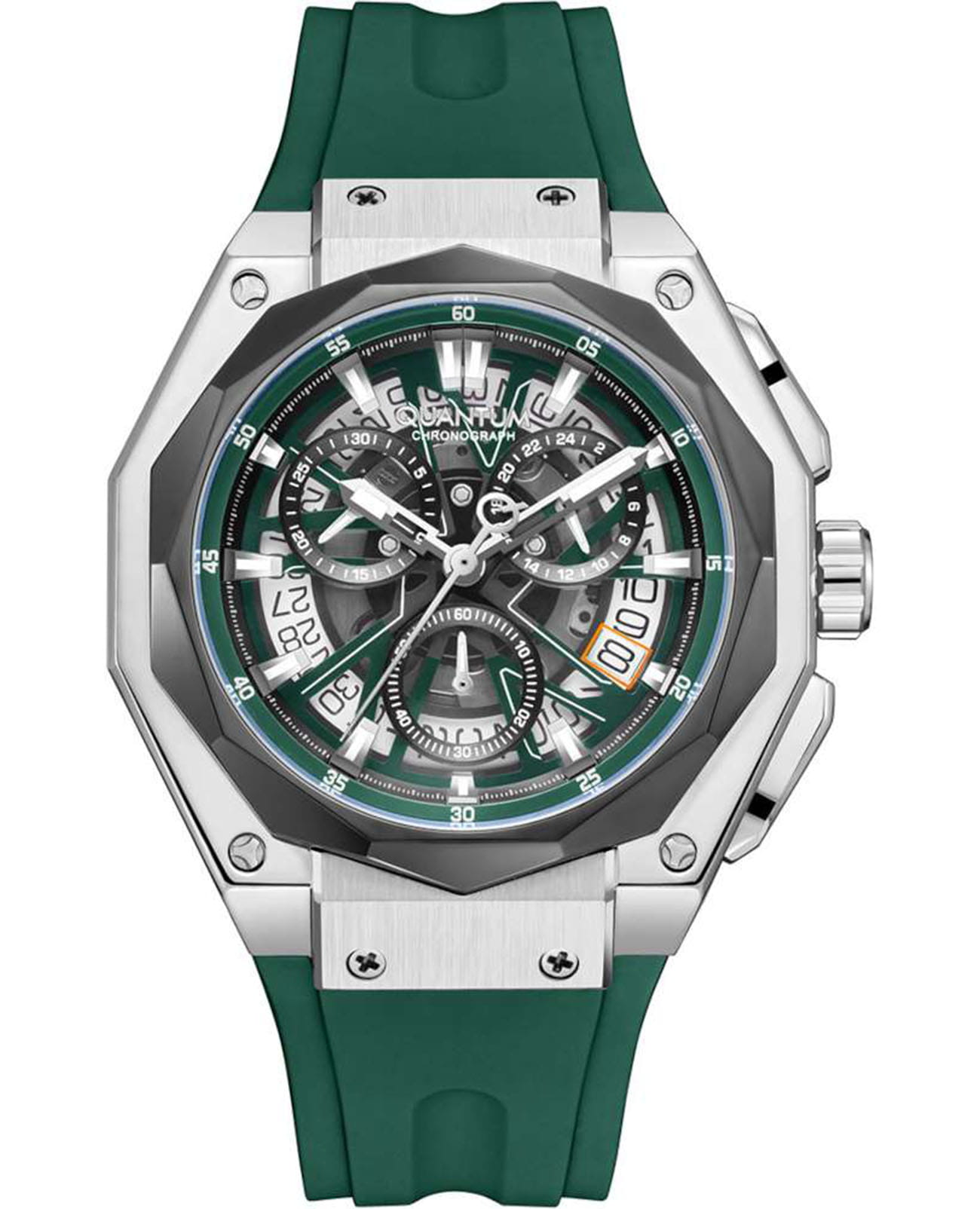 Мужские кварцевые часы Quantum HNG1097.356 из коллекции Hunter — круглый корпус размером 47 мм из нержавеющей стали, оснащённый функциями хронографаХронографФункция позволяет измерять отрезки времени с особой точностью: часы, минуты, секунды. Верным признаком хронографа является наличие на циферблате 3 дополнительных окошек-счётчиков. и окошком даты. БезельБезельВнешний ободок, закрепляющий стекло. В спортивных часах так называется поворотное кольцо с делениями на циферблате, выполняет роль таймера – замеряет отрезки времени на шкале. Неподвижный безель – элемент декора. Однонаправленно вращающийся безель на дайверских часах позволяет фиксировать моменты погружения и выныривания на поверхность. из нержавеющей стали с PVD-покрытиемPVDУльтратонкое покрытие наносится в технике вакуумного напыления, сочетает в себе нитрид титана особой прочности со слоем золота или оксида хрома. Несёт в себе декоративную или защитную функцию.. Стекло — минеральноеМинеральное стеклоМинеральное стекло представляет собой искусственно выращенный минерал кварца. Такое стекло отличается особой устойчивостью к повреждениям и царапинам. Уступает по некоторым качествам сапфировому стеклу. с антибликовым покрытием. Стрелки и метки с люминесцентным покрытиемЛюминесцентное покрытиеПозволяет считывать показания времени в темноте. Производители наносят на стрелки, часовые индексы, безель или поверхность циферблата светонакопительный состав, дающий холодное свечение.. Механизм — японский кварцевый Seiko. Водонепроницаемость 100 м. Ремешок — зелёный силиконовый на стандартной застёжке. Идеальный выбор для тех, кто ценит турецкий дизайн и функциональный спортивный стиль.