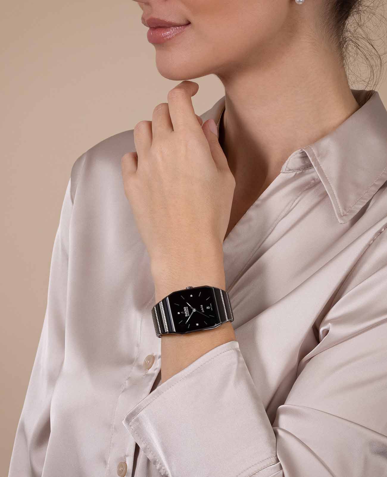 Мужские швейцарские механические часы Rado Anatom Automatic R10204712. Сапфировое стеклоСапфировое стеклоПрочный и надёжный материал из кристалла сапфира синтетического происхождения, характеризующийся особой твёрдостью и устойчивостью к царапинам и повреждениям. устойчивое к мелким механическим повреждениям. Корпус часов изготовлен из нержавеющей стали и керамики. Стрелки с люминесцентным покрытиемЛюминесцентное покрытиеПозволяет считывать показания времени в темноте. Производители наносят на стрелки, часовые индексы, безель или поверхность циферблата светонакопительный состав, дающий холодное свечение.. Венчает циферблат на отметке 12 часов культовый подвижный якорь, дополненный сдержанным окошком даты, расположенным на отметке 6 часов. Класс водозащиты: 50 метров, позволит защитить корпус от случайных брызг или капель дождя. Браслет из полированных черных высокотехнологичных керамических звеньев и полированных средних звеньев из нержавеющей стали, инкрустированных 162 бриллиантами Top Wesselton полной огранки, браслет тщательно закреплен на застёжке-бабочке с кнопкамиЗастёжка "бабочка"Такой вид застёжки дополняется предохранителями, помогающими избежать случайного раскрытия браслета. Обладают изящным исполнением. . 3 бриллианта Top Wesselton полной огранки и стрелки цвета родия с белым покрытием Super-LumiNova® создают сияющий контраст на фоне глубины циферблата.