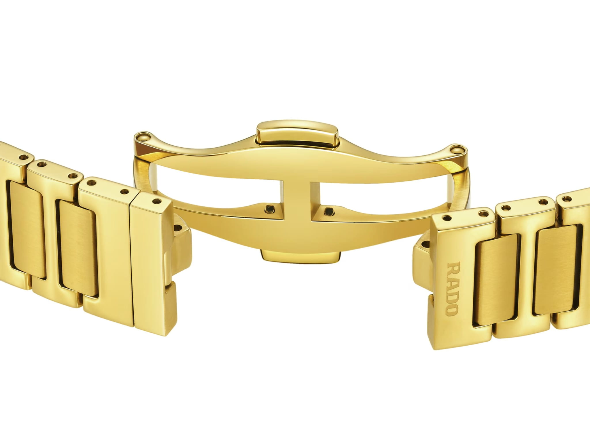 Женские механические часы с автоподзаводом Rado из коллекции Diastar Original — это икона швейцарского мастерства и инноваций. Корпус диаметром 30 мм и толщиной 11 мм выполнен из нержавеющей стали с PVD-покрытиемPVDУльтратонкое покрытие наносится в технике вакуумного напыления, сочетает в себе нитрид титана особой прочности со слоем золота или оксида хрома. Несёт в себе декоративную или защитную функцию. жёлтого золота. БезельБезельВнешний ободок, закрепляющий стекло. В спортивных часах так называется поворотное кольцо с делениями на циферблате, выполняет роль таймера – замеряет отрезки времени на шкале. Неподвижный безель – элемент декора. Однонаправленно вращающийся безель на дайверских часах позволяет фиксировать моменты погружения и выныривания на поверхность. изготовлен из Ceramos™CeramosМатериал являет собой инновационное сочетание высокотехнологичной керамики и сплава металла. Он объединяет керамическую устойчивость к царапинам и металлический роскошный блеск. с покрытием жёлтого золота. Циферблат жёлтого цвета с двунаправленной шлифовкой украшен 11 бриллиантами и центральным подвижным якорем — фирменным элементом дизайна. Циферблат защищён фасетированным сапфировым стекломСапфировое стеклоПрочный и надёжный материал из кристалла сапфира синтетического происхождения, характеризующийся особой твёрдостью и устойчивостью к царапинам и повреждениям. с антибликовым покрытиемАнтибликовое покрытиеСлой оксида металла в 0,13-0,3 микрон, благодаря которому стекло часов не бликует и не отражает свет. Антибликовое покрытие уменьшает отражение света в 10 раз, обеспечивая отличную читаемость показателей циферблата. на внутренней стороне. Стрелки золотистого цвета с люминесцентным покрытиемЛюминесцентное покрытиеПозволяет считывать показания времени в темноте. Производители наносят на стрелки, часовые индексы, безель или поверхность циферблата светонакопительный состав, дающий холодное свечение. Super-Luminova®, обеспечивающим отличную читаемость в любых условиях. Механизм — автоматический калибр R586 с пружиной Nivachron™Nivachron™Специально разработанный инновационный сплав Nivachron™ повышает устойчивость часов к воздействию магнитных полей., отрегулированный в пяти положениях, с запасом хода 48 часов. Окошко даты расположено в положении 6 часов. Часы оснащены стальным браслетом с PVD-покрытиемPVDУльтратонкое покрытие наносится в технике вакуумного напыления, сочетает в себе нитрид титана особой прочности со слоем золота или оксида хрома. Несёт в себе декоративную или защитную функцию. жёлтого золота и застёжкой «бабочка» с кнопкамиЗастёжка "бабочка"Такой вид застёжки дополняется предохранителями, помогающими избежать случайного раскрытия браслета. Обладают изящным исполнением. из стали с PVD-покрытиемPVDУльтратонкое покрытие наносится в технике вакуумного напыления, сочетает в себе нитрид титана особой прочности со слоем золота или оксида хрома. Несёт в себе декоративную или защитную функцию.. Водонепроницаемость 100 м позволяет использовать часы для плавания. Идеальный выбор для тех, кто ценит роскошь, точность и смелый дизайн.