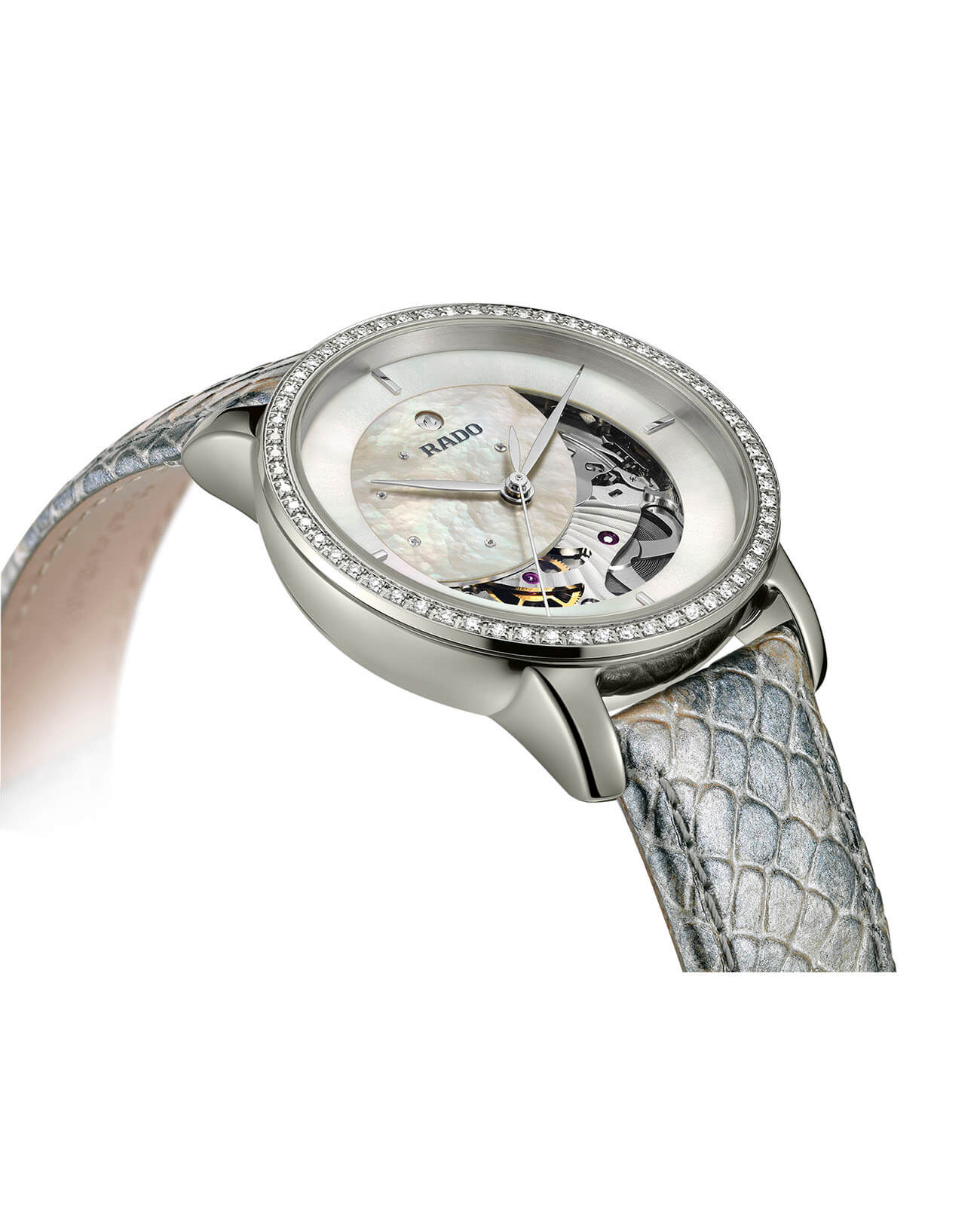 Дизайн модели является действительно роскошным - светлый циферблат дополнен двумя окружностями, декорированными сияющими драгоценными камнями. Безель украшен 60 бриллиантами, а скелетонизированное отверстие, сквозь которое просматривается движение деталей механизма, инкрустировано 5 бриллиантами в 0,004 и 0,002 карат. Часы оснащены автоматическим калибром ETA C07.631 с увеличенным резервом хода до 80 часов. Сапфировое стекло с антибликовой обработкой. Корпус из плазменной керамики