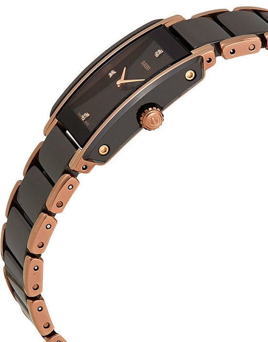 Наручным часам в шоколадном исполнении присущ роскошный стиль, изысканности добавляют 4 бриллианта в 0,026 карат, устоять перед их сиянием просто невозможно. Оригинальный браслет имеет высокопрочные вставки из высокотехнологичной керамикиВысокотехнологичная керамикаИнновационный запатентованный Rado материал с гладкой или матовой поверхностью. Керамика за счёт кристаллической структуры обладает повышенной устойчивостью от возникновения царапин. Материал способен принимать температуру тела человека, обеспечивая невероятный комфорт при ношении.. Модель комплектуется кварцевым механизмом ETA 976.001 с высокой точностью хода. Сапфировое стекло противостоит образованию царапин. Износоустойчивое PVD-покрытиеPVDУльтратонкое покрытие наносится в технике вакуумного напыления, сочетает в себе нитрид титана особой прочности со слоем золота или оксида хрома. Несёт в себе декоративную или защитную функцию. оттенка розового золота. Водостойкость 50 метров. Габариты: 22,7 x 33,1 x 6,5 мм.