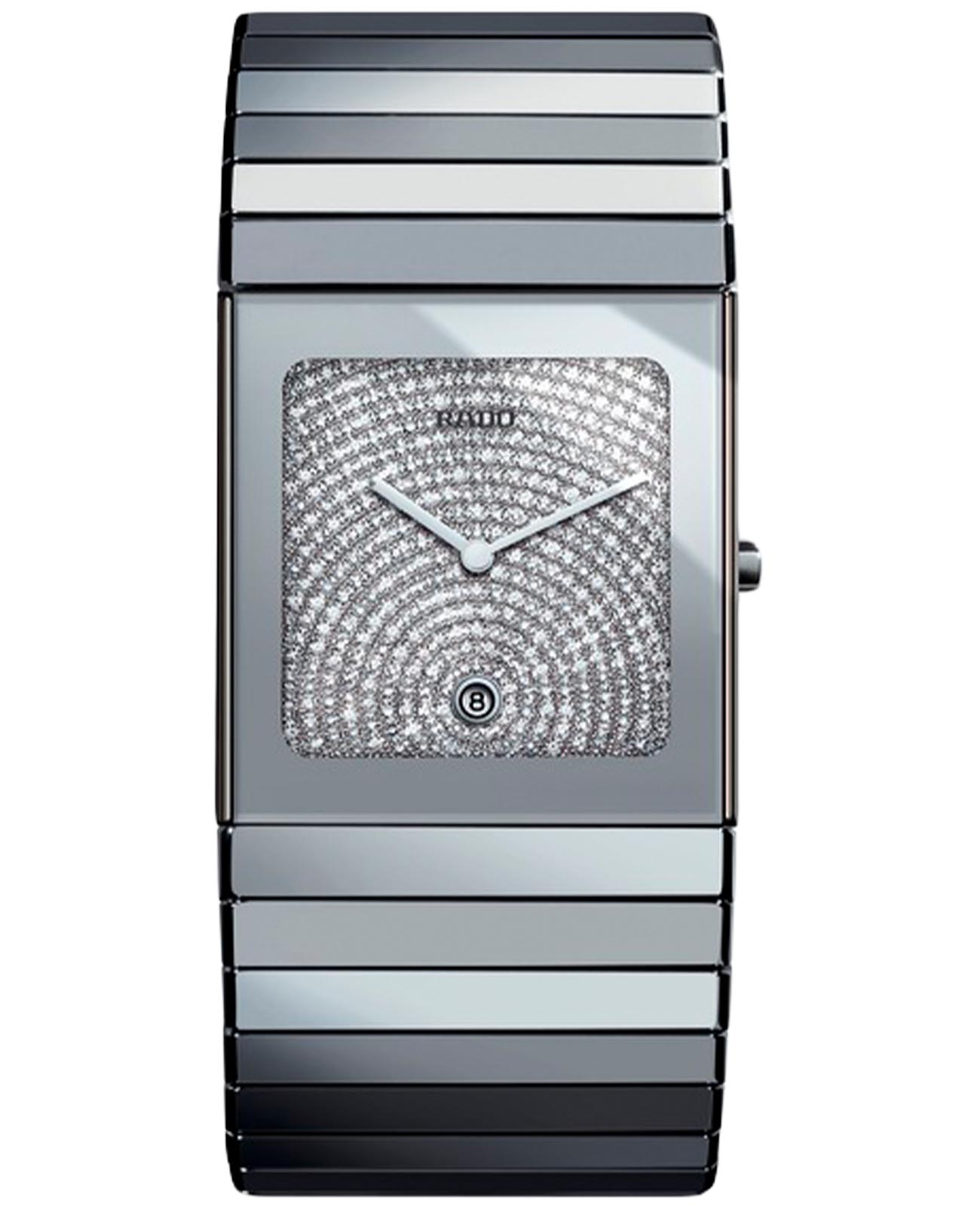 Швейцарские женские Rado Ceramica R21838302, кварцевый механизм с высокой точностью. Сапфировое стеклоСапфировое стеклоПрочный и надёжный материал из кристалла сапфира синтетического происхождения, характеризующийся особой твёрдостью и устойчивостью к царапинам и повреждениям. устойчивое к появлению царапин, обладающее высокой прозрачностью. Корпус часов изготовлен из нержавеющей стали и керамики. Класс водозащиты: 30 метров, позволит защитить корпус от случайных брызг или капель дождя. Керамический браслет на раскладной застёжкеРаскладная застёжкаТакой тип застёжки используется только на браслетах из металла. Она никогда не раскрывается полностью, происходит разделение на 2 и более частей. Раскладывающая застёжка снизит вероятность потери часов к минимуму.. Циферблат инкрустирован бриллиантами. Указатель даты на "6 часах". .