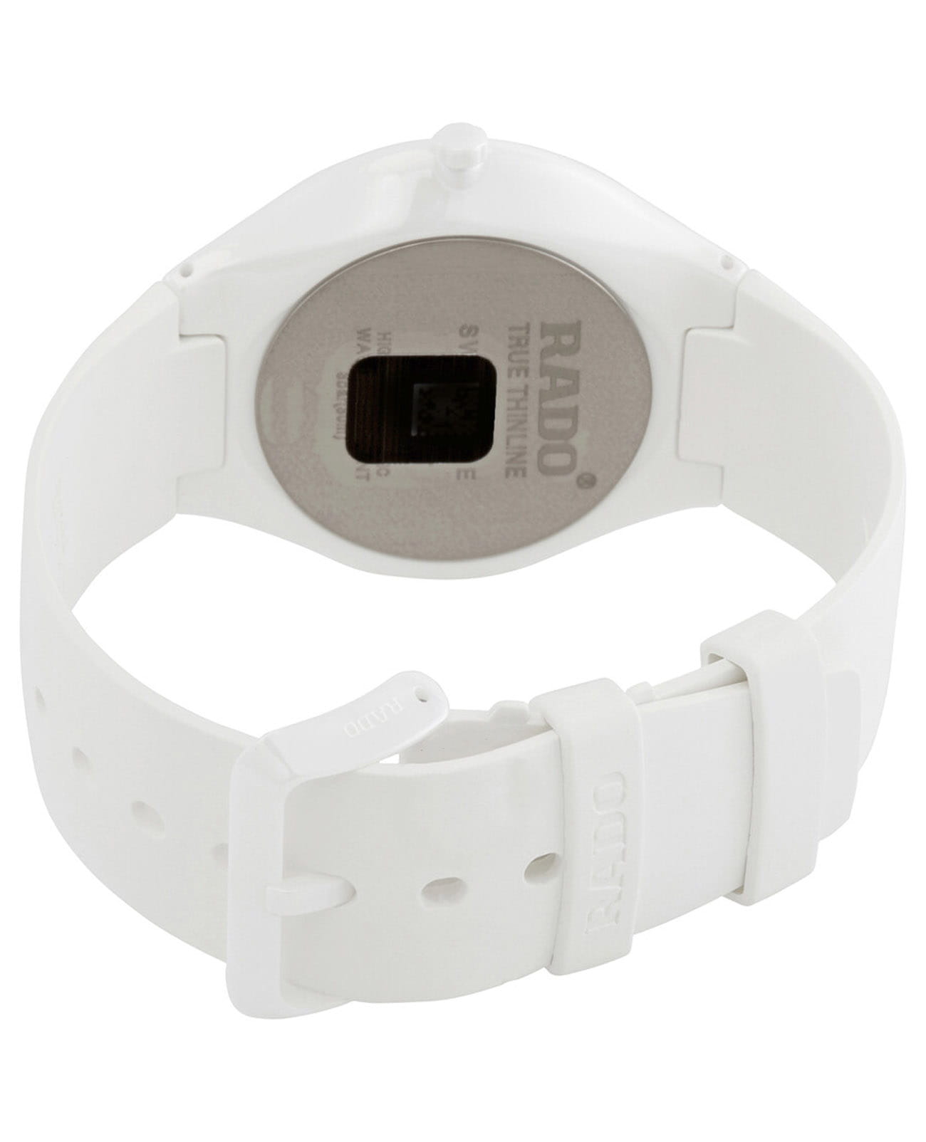 Женские механические швейцарские часы с автоподзаводом Rado True Thinline R27970109. Сапфировое стеклоСапфировое стеклоПрочный и надёжный материал из кристалла сапфира синтетического происхождения, характеризующийся особой твёрдостью и устойчивостью к царапинам и повреждениям. устойчивое к появлению царапин, обладающее высокой прозрачностью. Корпус часов изготовлен из высокотехнологичной керамикиВысокотехнологичная керамикаИнновационный запатентованный Rado материал с гладкой или матовой поверхностью. Керамика за счёт кристаллической структуры обладает повышенной устойчивостью от возникновения царапин. Материал способен принимать температуру тела человека, обеспечивая невероятный комфорт при ношении.. Класс водозащиты: 30 метров, позволит защитить корпус от случайных брызг или капель дождя. Каучуковый ремешок на стандартной застежке.