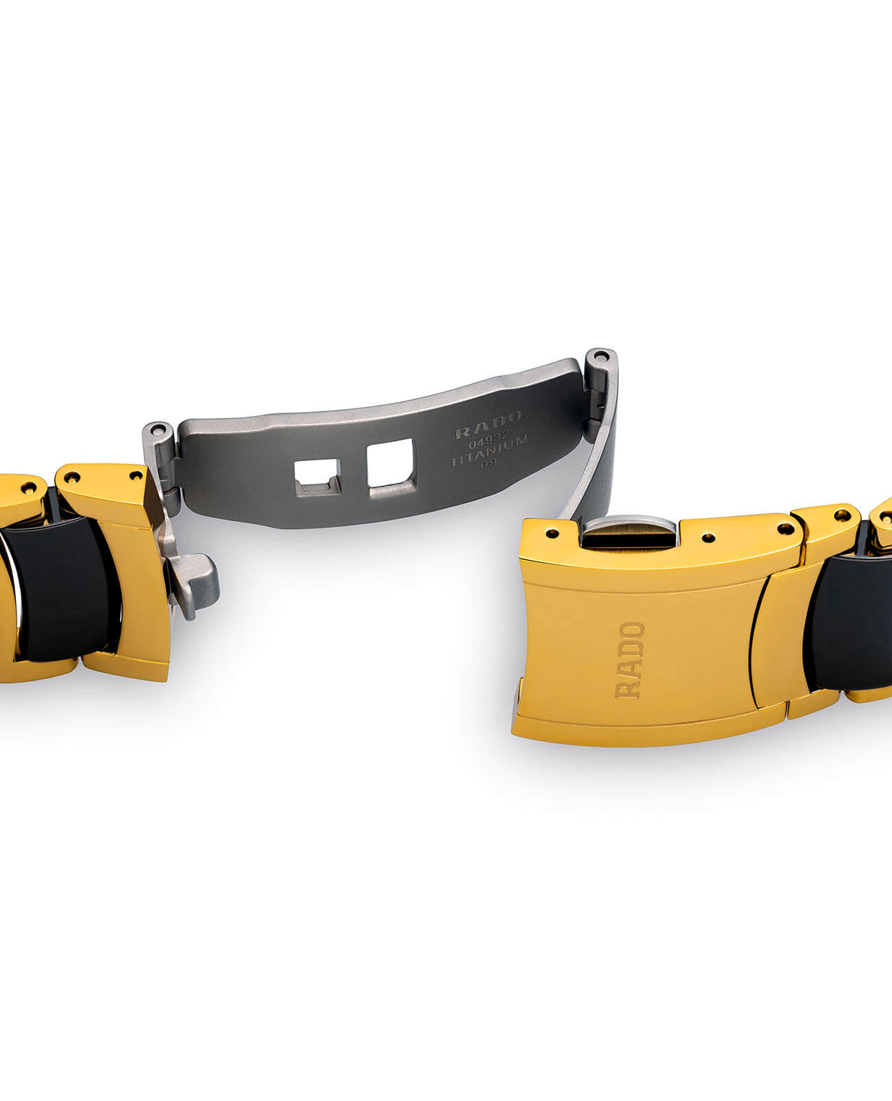 Утончённая модель в минималистичном стиле никогда не выйдет из моды, гармонично сочетаясь с любым нарядом. Элегантный чёрный циферблат дополнен золотистыми часовыми индексами и удлинёнными стрелками, обеспечивающими идеальную читаемость показателей времени. Часы оснащены высокоточным кварцевым механизмом ETA 956.112. Использование нержавеющей стали 316L с PVD-покрытиемPVDУльтратонкое покрытие наносится в технике вакуумного напыления, сочетает в себе нитрид титана особой прочности со слоем золота или оксида хрома. Несёт в себе декоративную или защитную функцию., высокотехнологичной керамикиВысокотехнологичная керамикаИнновационный запатентованный Rado материал с гладкой или матовой поверхностью. Керамика за счёт кристаллической структуры обладает повышенной устойчивостью от возникновения царапин. Материал способен принимать температуру тела человека, обеспечивая невероятный комфорт при ношении.. Надёжное стекло из сапфира. Водостойкость до 3 бар. Отображение текущего числа. Диаметр корпуса: 28 мм.