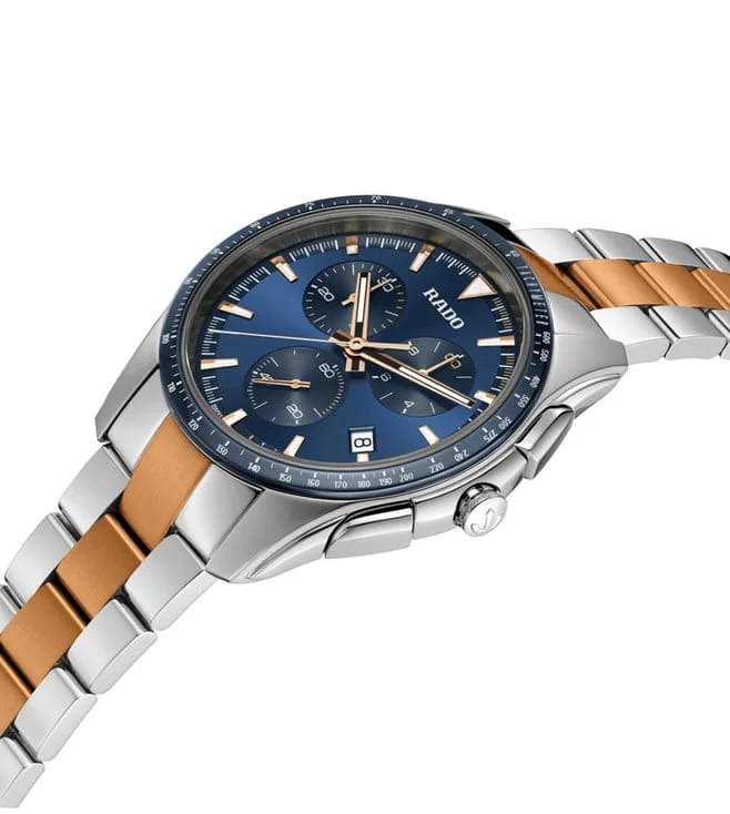 Мужские наручные часы-хронографХронографФункция позволяет измерять отрезки времени с особой точностью: часы, минуты, секунды. Верным признаком хронографа является наличие на циферблате 3 дополнительных окошек-счётчиков. Rado Hyperchrome Chronograph. Корпус часов изготовлен из нержавеющей стали. БезельБезельВнешний ободок, закрепляющий стекло. В спортивных часах так называется поворотное кольцо с делениями на циферблате, выполняет роль таймера – замеряет отрезки времени на шкале. Неподвижный безель – элемент декора. Однонаправленно вращающийся безель на дайверских часах позволяет фиксировать моменты погружения и выныривания на поверхность. из нержавеющей стали с PVD-покрытиемPVDУльтратонкое покрытие наносится в технике вакуумного напыления, сочетает в себе нитрид титана особой прочности со слоем золота или оксида хрома. Несёт в себе декоративную или защитную функцию... Стальной браслет с частичным PVD-покрытиемPVDУльтратонкое покрытие наносится в технике вакуумного напыления, сочетает в себе нитрид титана особой прочности со слоем золота или оксида хрома. Несёт в себе декоративную или защитную функцию. на застёжкой «бабочка» с кнопкамиЗастёжка "бабочка"Такой вид застёжки дополняется предохранителями, помогающими избежать случайного раскрытия браслета. Обладают изящным исполнением. . БезельБезельВнешний ободок, закрепляющий стекло. В спортивных часах так называется поворотное кольцо с делениями на циферблате, выполняет роль таймера – замеряет отрезки времени на шкале. Неподвижный безель – элемент декора. Однонаправленно вращающийся безель на дайверских часах позволяет фиксировать моменты погружения и выныривания на поверхность. со шкалой тахиметраТахиметрРазмеченная шкала, располагается на ободке или безеле часов. Тахиметр позволяет рассчитать скорость на определённом участке пути, расстояние измеряется в километрах или милях.. Окошко даты находится в положении 4 часа. Стрелки и метки с люминесцентным покрытиемЛюминесцентное покрытиеПозволяет считывать показания времени в темноте. Производители наносят на стрелки, часовые индексы, безель или поверхность циферблата светонакопительный состав, дающий холодное свечение.. Сапфировое стеклоСапфировое стеклоПрочный и надёжный материал из кристалла сапфира синтетического происхождения, характеризующийся особой твёрдостью и устойчивостью к царапинам и повреждениям. с антибликовым покрытиемАнтибликовое покрытиеСлой оксида металла в 0,13-0,3 микрон, благодаря которому стекло часов не бликует и не отражает свет. Антибликовое покрытие уменьшает отражение света в 10 раз, обеспечивая отличную читаемость показателей циферблата. устойчивое к мелким механическим повреждениям. Класс водозащиты: 100 метров, позволит плавать, нырять и заниматься другими водными видами спорта.