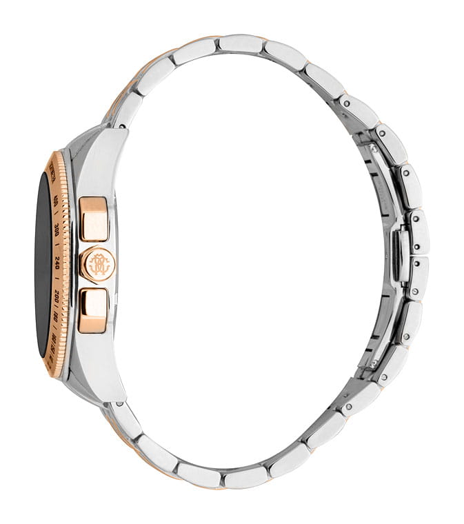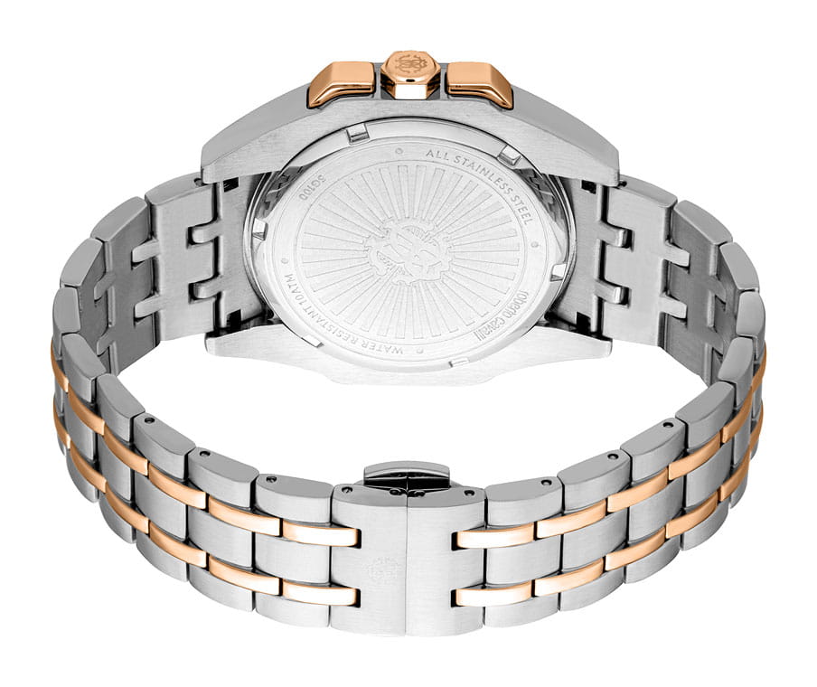 Погрузитесь в мир роскоши и безупречного стиля с мужскими наручными часами ROBERTO CAVALLI RC5G100M0085. Эти часы-хронографХронографФункция позволяет измерять отрезки времени с особой точностью: часы, минуты, секунды. Верным признаком хронографа является наличие на циферблате 3 дополнительных окошек-счётчиков. воплощение смелого дизайна и итальянской элегантности, созданные для мужчины, который ценит внимание к деталям и не боится заявить о себе. Круглый корпус диаметром 40 мм выполнен из нержавеющей стали, толщина корпуса составляет 12 мм, что придает модели выразительный внешний вид и надежную защиту от внешних воздействий. Циферблат, искусно оформленный фирменными элементами Roberto Cavalli, притягивает взгляд и подчеркивает ваш безупречный вкус. Часы оснащены кварцевым механизмом, обладают функцией отображения даты, а также тахиметромТахиметрРазмеченная шкала, располагается на ободке или безеле часов. Тахиметр позволяет рассчитать скорость на определённом участке пути, расстояние измеряется в километрах или милях., что делает их удобными для ежедневного использования. Минеральное стеклоМинеральное стеклоМинеральное стекло представляет собой искусственно выращенный минерал кварца. Такое стекло отличается особой устойчивостью к повреждениям и царапинам. Уступает по некоторым качествам сапфировому стеклу. защищает часы от царапин. Водозащита 100 метров, позволит плавать, нырять и заниматься другими водными видами спорта. Стальной браслет с частичным PVD-покрытиемPVDУльтратонкое покрытие наносится в технике вакуумного напыления, сочетает в себе нитрид титана особой прочности со слоем золота или оксида хрома. Несёт в себе декоративную или защитную функцию. на застёжке-бабочке с кнопкамиЗастёжка "бабочка"Такой вид застёжки дополняется предохранителями, помогающими избежать случайного раскрытия браслета. Обладают изящным исполнением.  обеспечивает комфортное ношение. Неподвижный безельБезельВнешний ободок, закрепляющий стекло. В спортивных часах так называется поворотное кольцо с делениями на циферблате, выполняет роль таймера – замеряет отрезки времени на шкале. Неподвижный безель – элемент декора. Однонаправленно вращающийся безель на дайверских часах позволяет фиксировать моменты погружения и выныривания на поверхность. с PVD-покрытиемPVDУльтратонкое покрытие наносится в технике вакуумного напыления, сочетает в себе нитрид титана особой прочности со слоем золота или оксида хрома. Несёт в себе декоративную или защитную функцию.. Стрелки и метки с люминесцентным покрытиемЛюминесцентное покрытиеПозволяет считывать показания времени в темноте. Производители наносят на стрелки, часовые индексы, безель или поверхность циферблата светонакопительный состав, дающий холодное свечение. обеспечивают отличную читаемость в любое время суток.