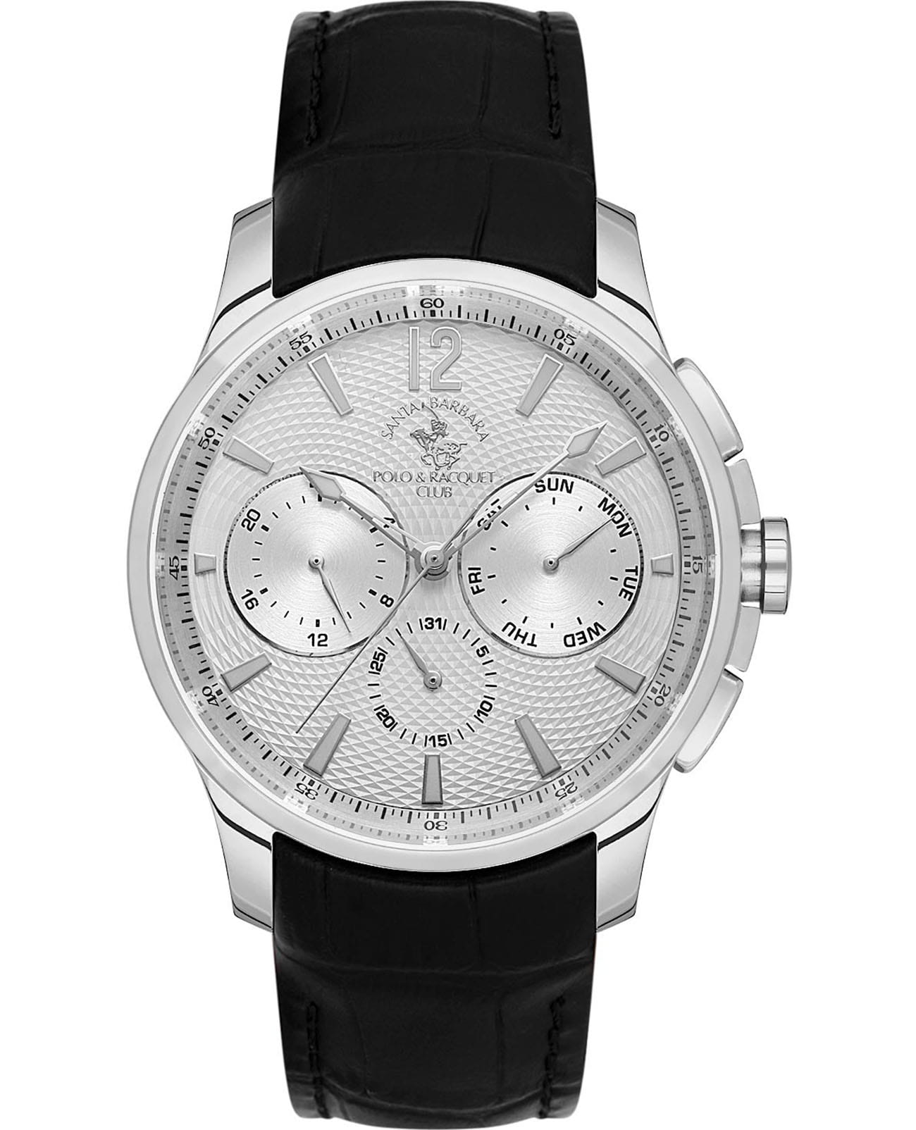 Мужские кварцевые часы Santa Barbara Polo & Racquet Club — это идеальный выбор для тех, кто ценит практичность и стиль. Корпус диаметром 43 мм выполнен из нержавеющей стали 316L с полированной отделкой. Циферблат серебристого цвета украшен узором и фирменным логотипом, дополнен накладными метками в виде штрихов и арабской цифрой 12. Указатели дня недели и даты вынесены на отдельные субциферблаты, также присутствует индикация 24-часового формата времени. Стрелки и метки с люминесцентным покрытиемЛюминесцентное покрытиеПозволяет считывать показания времени в темноте. Производители наносят на стрелки, часовые индексы, безель или поверхность циферблата светонакопительный состав, дающий холодное свечение., обеспечивающим хорошую читаемость в темноте. Циферблат защищён минеральным стекломМинеральное стеклоМинеральное стекло представляет собой искусственно выращенный минерал кварца. Такое стекло отличается особой устойчивостью к повреждениям и царапинам. Уступает по некоторым качествам сапфировому стеклу.. Часы оснащены кожаным ремешком с застёжкой «бабочка» с кнопкамиЗастёжка "бабочка"Такой вид застёжки дополняется предохранителями, помогающими избежать случайного раскрытия браслета. Обладают изящным исполнением. . Водонепроницаемость 50 м позволяет использовать часы в повседневных условиях. Идеальный выбор для тех, кто ценит классический дизайн, точность и надёжность.