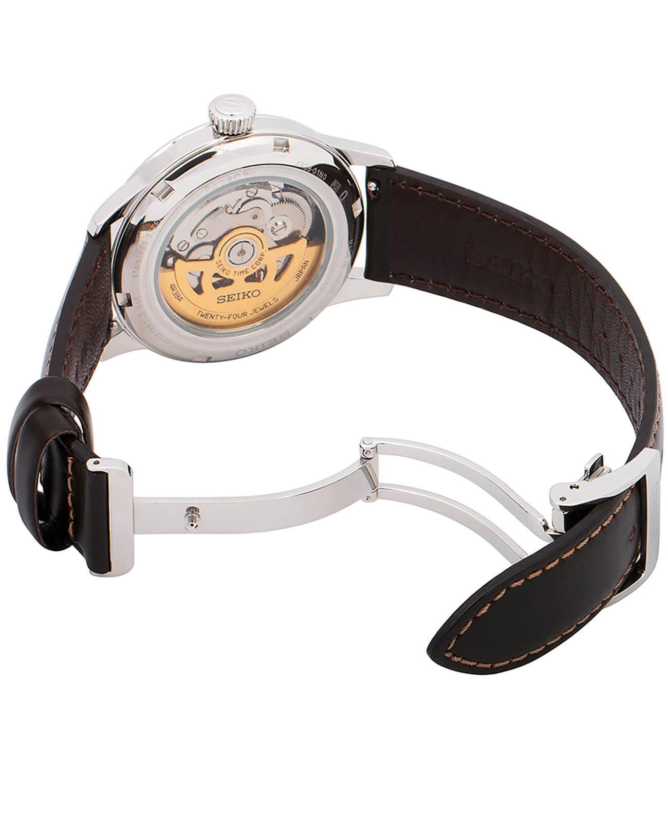 Модель – парный вариант мужских часов Seiko SSA407J1. Аксессуар наделён стильным циферблатом с элегантным узором. Скелетонизированная модель дополнена круглым окошком на метке 9 часов, что позволяет наблюдать за перемещением деталей. Этому способствует и прозрачная задняя крышка, выставляя напоказ работу японского автоматического механизма Seiko 4R38 с запасом хода 40 часов. Функция «stop-second» предоставляет возможность остановить часовой механизм для регулировки времени с точностью до секунды. Ремешок изготовлен из натуральной кожи. Циферблат защищён прочным минеральным стеклом Hardlex, устойчивым к царапинам. Диаметр корпуса: 33,8 мм.
