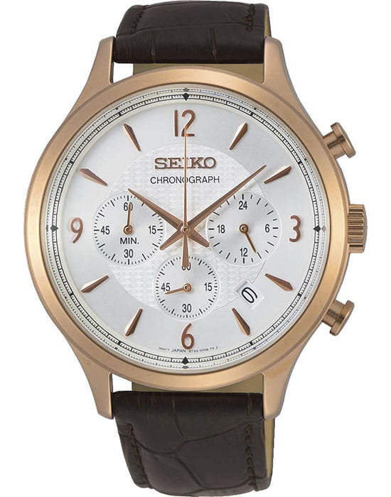 Аксессуар представлен в элегантном стиле, лаконичный корпус из стали 316L с PVD-финишемPVDУльтратонкое покрытие наносится в технике вакуумного напыления, сочетает в себе нитрид титана особой прочности со слоем золота или оксида хрома. Несёт в себе декоративную или защитную функцию. гармонично сочетается с ремешком из натуральной телячьей кожи. Японский кварцевый механизм Seiko 8T67 отличается с точностью хода ±15 секунд в месяц. Прочное минеральное стекло Hardlex устойчиво к царапинам. Функции: секундомер, хронографХронографФункция позволяет измерять отрезки времени с особой точностью: часы, минуты, секунды. Верным признаком хронографа является наличие на циферблате 3 дополнительных окошек-счётчиков., календарь.