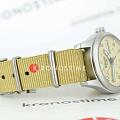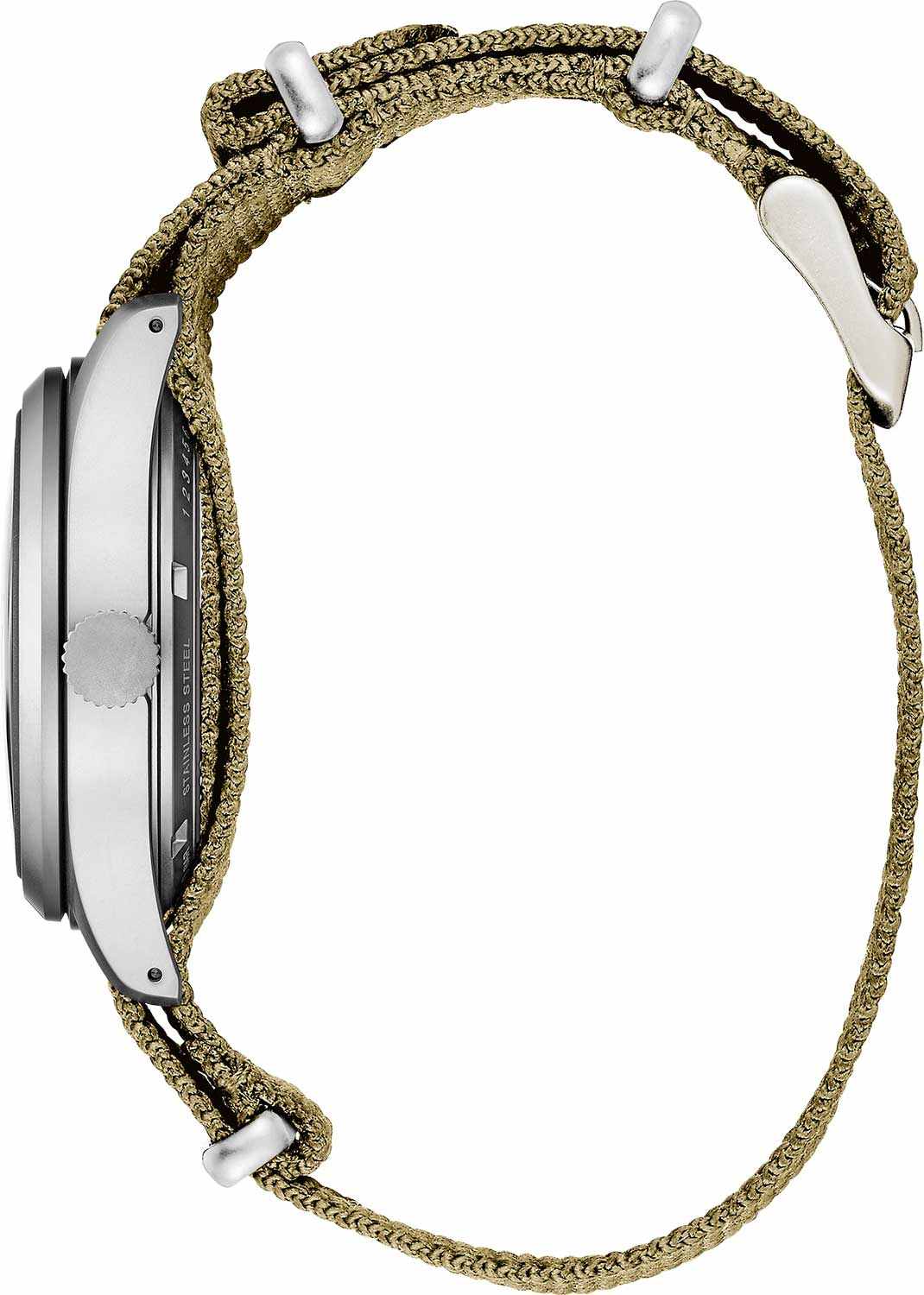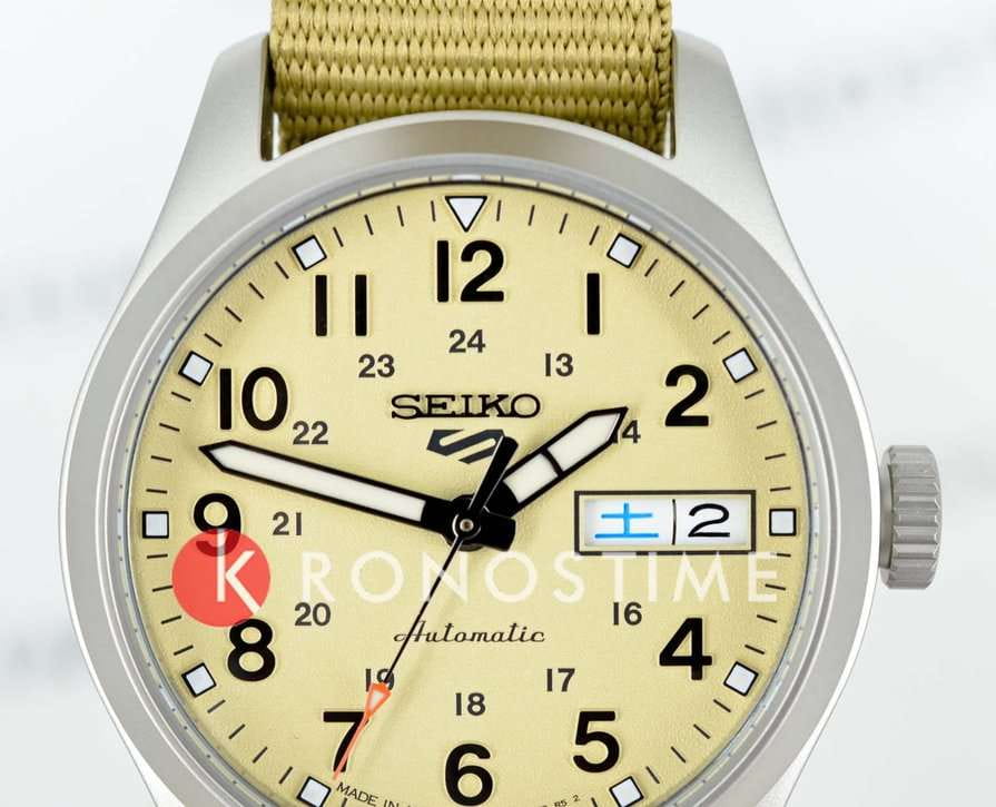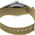 Модель Seiko SRPJ83K1 из серии Seiko 5 Sports Mid-Field — это компактные и надёжные автоматические часы в военном стиле с характерным «пустынным» оттенком. Корпус диаметром 36,4 мм выполнен из нержавеющей стали, оснащён прозрачной задней крышкой и обеспечивает водозащиту до 100 метров. Фиксированный стальной безельБезельВнешний ободок, закрепляющий стекло. В спортивных часах так называется поворотное кольцо с делениями на циферблате, выполняет роль таймера – замеряет отрезки времени на шкале. Неподвижный безель – элемент декора. Однонаправленно вращающийся безель на дайверских часах позволяет фиксировать моменты погружения и выныривания на поверхность. подчёркивает сдержанный и утилитарный дизайн модели. Песочный циферблат оформлен с акцентом на читаемость: крупная 12/24-часовая шкала, контрастные стрелки и метки с люминесцентным покрытиемЛюминесцентное покрытиеПозволяет считывать показания времени в темноте. Производители наносят на стрелки, часовые индексы, безель или поверхность циферблата светонакопительный состав, дающий холодное свечение. LumiBrite. На позиции «3 часа» расположены индикаторы даты и дня недели. Циферблат защищён прочным минеральным стекломМинеральное стеклоМинеральное стекло представляет собой искусственно выращенный минерал кварца. Такое стекло отличается особой устойчивостью к повреждениям и царапинам. Уступает по некоторым качествам сапфировому стеклу. Hardlex с куполообразной формой. Внутри установлен автоматический механизм Seiko 4R36 с функцией ручного подзавода, остановкой секундной стрелки, запасом хода до 41 часа и двойной календарной индикацией. Модель комплектуется текстильным ремешком NATOРемешок NATOРемешок NATO — это прочный, универсальный и сменный часовой ремешок, изначально созданный для военных. Он изготовлен из нейлона или другого прочного материала и имеет уникальную конструкцию, которая позволяет часам оставаться на запястье даже в случае поломки одной из прикрепляющих точек. песочного цвета шириной 18 мм — удобным, лёгким и устойчивым к износу. Seiko SRPJ83K1 — это универсальные полевые часы с характером и компактным корпусом, сочетающие практичность, военную строгость и надёжную механику.