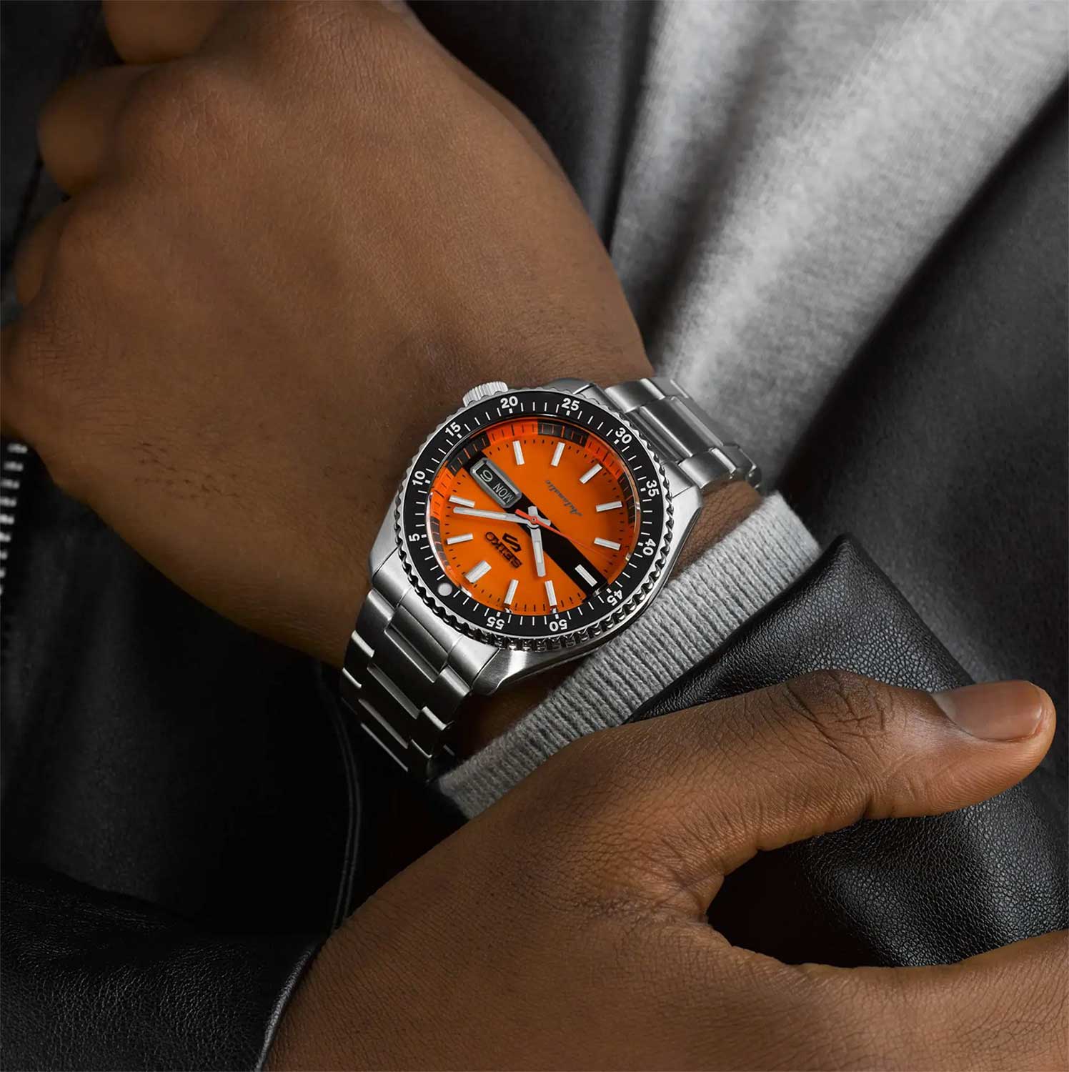 Часы Seiko 5 Sports SRPK11K1 из коллекции "New Double Hurricane" представляют собой современную интерпретацию популярных моделей конца 1960-х годов. Корпус диаметром 42,5 мм выполнен из нержавеющей стали, а яркий оранжевый циферблат защищён минеральным стекломМинеральное стеклоМинеральное стекло представляет собой искусственно выращенный минерал кварца. Такое стекло отличается особой устойчивостью к повреждениям и царапинам. Уступает по некоторым качествам сапфировому стеклу. с повышенной прочностью. ​​