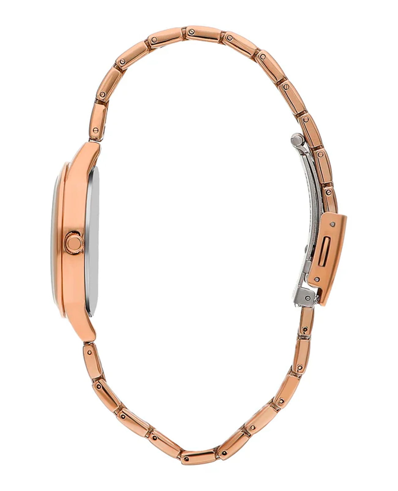 Женские наручные часы Slazenger SL.09.2016.3.04 из новой коллекции бренда сочетают в себе элегантность и современные технологии. Модель имеет круглый корпус диаметром 32 мм, изготовленный из суперметалла с IP-покрытиемIP-покрытиеМетод ионного напыления. Демонстрирует повышенную устойчивость к истиранию, окислению и химическим веществам. Под воздействием высокого давления и температуры около 1500°C молекулы металла надёжно соединяются с частицами корпуса часов. розового оттенка, что обеспечивает высокую устойчивость к внешним воздействиям и привлекательный внешний вид . Браслет выполнен из металла с раскладной застежкойРаскладной замокДанный вариант застежки используется только на часах с металлическим браслетом. Отличительная особенность такого крепления в том, что длина браслета становится универсальной и вы можете самостоятельно отрегулировать нужный вам размер – застежка просто двигается по браслету часов., обеспечивающей комфортное ношение и надежную фиксацию на запястье. Циферблат защищен прочным минеральным стекломМинеральное стеклоМинеральное стекло представляет собой искусственно выращенный минерал кварца. Такое стекло отличается особой устойчивостью к повреждениям и царапинам. Уступает по некоторым качествам сапфировому стеклу., устойчивым к царапинам. Часы оснащены точным кварцевым механизмом японского производства, гарантирующим стабильную работу и точность хода. Модель обладает водонепроницаемостью до 5 атмосфер (WR 50), что позволяет использовать их в условиях легкого контакта с водой, например, при мытье рук или хождении под мелким дождем, однако не рекомендуется для плавания или дайвинга. Вес часов составляет 69 грамм, что делает их удобными для повседневного использования.