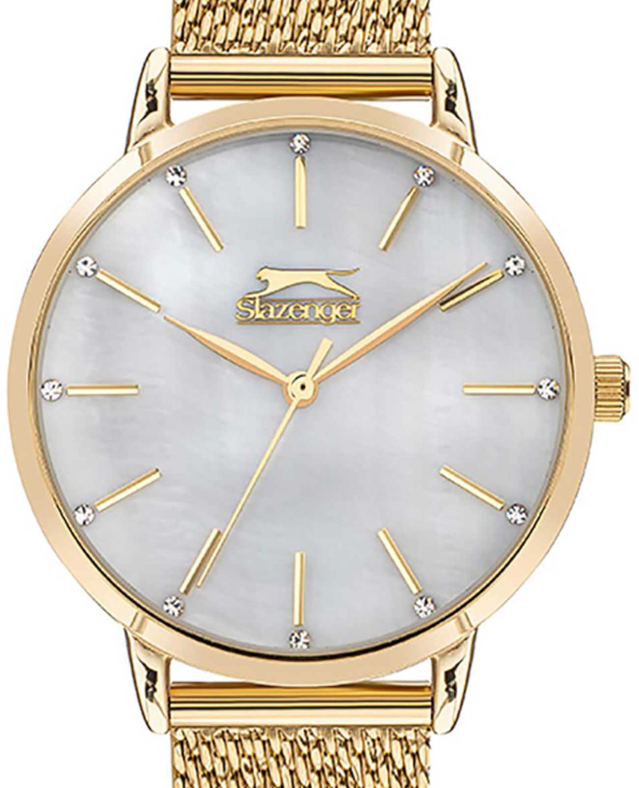 Slazenger SL.09.2047.3.04 – элегантные женские часы, сочетающие стильный дизайн и функциональность. Корпус диаметром 35 мм и толщиной 9 мм выполнен из суперметалла с PVD-покрытиемPVDУльтратонкое покрытие наносится в технике вакуумного напыления, сочетает в себе нитрид титана особой прочности со слоем золота или оксида хрома. Несёт в себе декоративную или защитную функцию., обеспечивающего прочность и долговечность. Циферблат защищён минеральным стекломМинеральное стеклоМинеральное стекло представляет собой искусственно выращенный минерал кварца. Такое стекло отличается особой устойчивостью к повреждениям и царапинам. Уступает по некоторым качествам сапфировому стеклу., устойчивым к царапинам и украшен фианитами. Часы оснащены точным кварцевым механизмом, обеспечивающим надёжное отображение времени. Браслет из суперметалла с PVD-покрытиемPVDУльтратонкое покрытие наносится в технике вакуумного напыления, сочетает в себе нитрид титана особой прочности со слоем золота или оксида хрома. Несёт в себе декоративную или защитную функцию. миланского плетения на раскладном замкеРаскладной замокДанный вариант застежки используется только на часах с металлическим браслетом. Отличительная особенность такого крепления в том, что длина браслета становится универсальной и вы можете самостоятельно отрегулировать нужный вам размер – застежка просто двигается по браслету часов., обеспечивающей комфортное ношение и надёжную фиксацию на запястье. Водозащита до 30 метров (3 ATM) защищает часы от случайных брызг и дождя, делая их подходящими для повседневного использования.