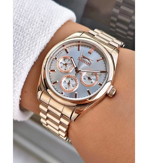 Женские наручные часы Slazenger SL.09.2063.4.02 сочетают в себе классический дизайн и высокое качество исполнения. Модель обладает круглым корпусом диаметром 36 мм, изготовленным из суперметалла с золотистым IP-покрытиемIP-покрытиеМетод ионного напыления. Демонстрирует повышенную устойчивость к истиранию, окислению и химическим веществам. Под воздействием высокого давления и температуры около 1500°C молекулы металла надёжно соединяются с частицами корпуса часов. покрытием, что обеспечивает устойчивость к внешним воздействиям. Браслет выполнен из суперметалла с IP-покрытиемIP-покрытиеМетод ионного напыления. Демонстрирует повышенную устойчивость к истиранию, окислению и химическим веществам. Под воздействием высокого давления и температуры около 1500°C молекулы металла надёжно соединяются с частицами корпуса часов. на раскладной застёжкеРаскладная застёжкаТакой тип застёжки используется только на браслетах из металла. Она никогда не раскрывается полностью, происходит разделение на 2 и более частей. Раскладывающая застёжка снизит вероятность потери часов к минимуму.. Белый циферблат украшен логотипом бренда и метками времени. Имеются дополнительные малые циферблаты для отображения даты, дня недели и текущего времени в 24-часовом формате. Для защиты используется минеральное стеклоМинеральное стеклоМинеральное стекло представляет собой искусственно выращенный минерал кварца. Такое стекло отличается особой устойчивостью к повреждениям и царапинам. Уступает по некоторым качествам сапфировому стеклу., обеспечивающее прочную защиту от царапин. Стрелки и метки имеют люминесцентное покрытиеЛюминесцентное покрытиеПозволяет считывать показания времени в темноте. Производители наносят на стрелки, часовые индексы, безель или поверхность циферблата светонакопительный состав, дающий холодное свечение., что позволяет легко читать время в темноте. Часы работают на японском кварцевом механизме, который обеспечивает точность хода без необходимости подзаводки. Водонепроницаемость часов составляет 3 атмосферы (WR30), что позволяет защитить корпус от случайных брызг или капель дождя.