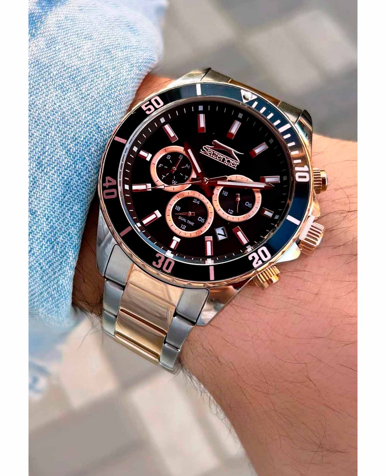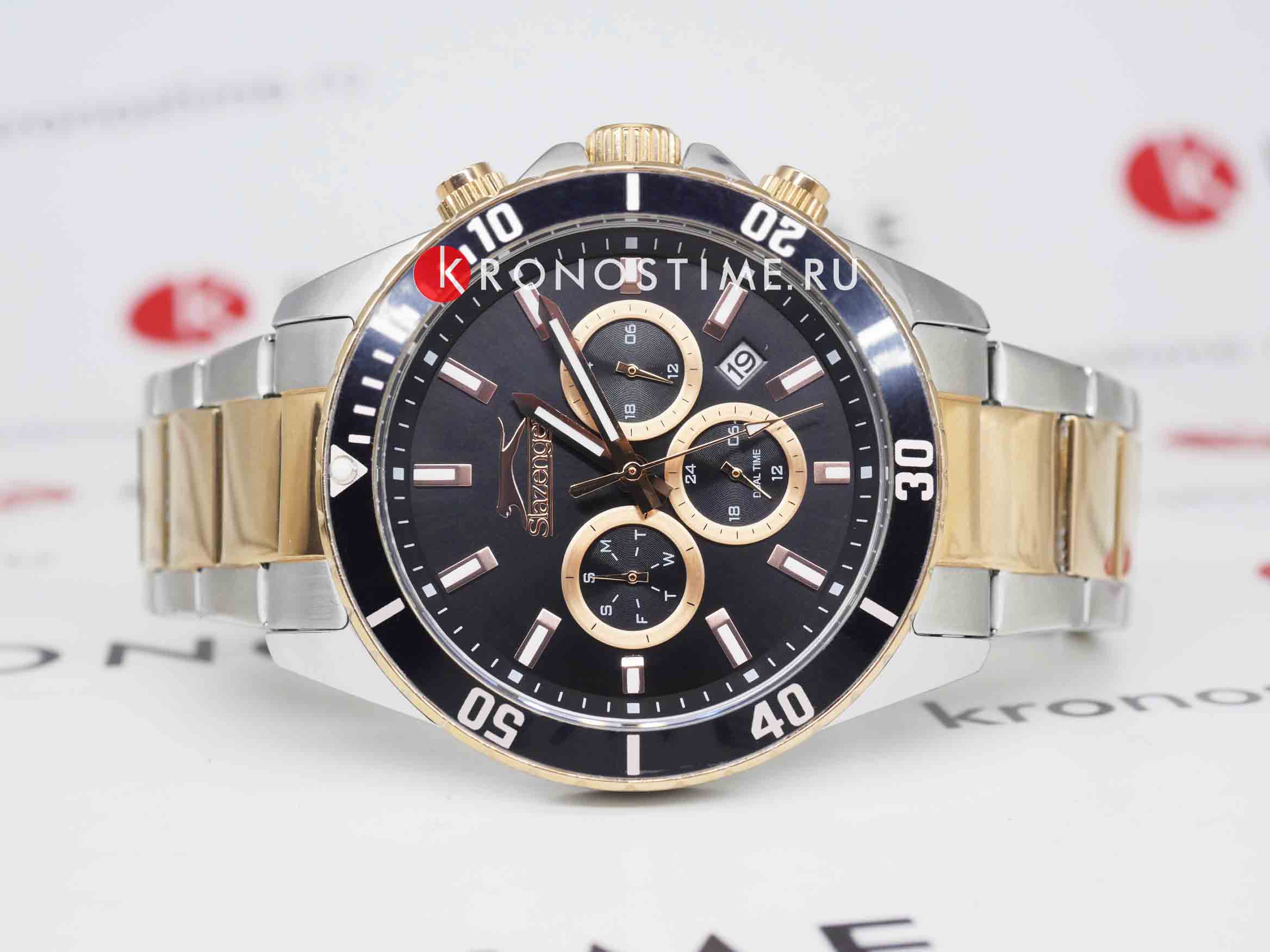 Мужские наручные часы Slazenger SL.09.2091.2.05 сочетают в себе классический дизайн и современные технологии. Модель обладает круглым корпусом диаметром 44 мм из суперметалла, поворотный безельБезельВнешний ободок, закрепляющий стекло. В спортивных часах так называется поворотное кольцо с делениями на циферблате, выполняет роль таймера – замеряет отрезки времени на шкале. Неподвижный безель – элемент декора. Однонаправленно вращающийся безель на дайверских часах позволяет фиксировать моменты погружения и выныривания на поверхность. с IP-покрытиемIP-покрытиеМетод ионного напыления. Демонстрирует повышенную устойчивость к истиранию, окислению и химическим веществам. Под воздействием высокого давления и температуры около 1500°C молекулы металла надёжно соединяются с частицами корпуса часов., что обеспечивает устойчивость к царапинам и коррозии. Браслет изготовлен из нержавеющей стали с частичным IP-покрытиемIP-покрытиеМетод ионного напыления. Демонстрирует повышенную устойчивость к истиранию, окислению и химическим веществам. Под воздействием высокого давления и температуры около 1500°C молекулы металла надёжно соединяются с частицами корпуса часов. на раскладной застежкеРаскладной замокДанный вариант застежки используется только на часах с металлическим браслетом. Отличительная особенность такого крепления в том, что длина браслета становится универсальной и вы можете самостоятельно отрегулировать нужный вам размер – застежка просто двигается по браслету часов., гарантирующей удобство и надежность при ношении. Циферблат черного цвета украшен стрелками с люминесцентным покрытиемЛюминесцентное покрытиеПозволяет считывать показания времени в темноте. Производители наносят на стрелки, часовые индексы, безель или поверхность циферблата светонакопительный состав, дающий холодное свечение., что обеспечивает читаемость времени даже в условиях слабого освещения. Для защиты циферблата используется минеральное стеклоМинеральное стеклоМинеральное стекло представляет собой искусственно выращенный минерал кварца. Такое стекло отличается особой устойчивостью к повреждениям и царапинам. Уступает по некоторым качествам сапфировому стеклу., устойчивое к царапинам и повреждениям. Часы оснащены кварцевым механизмом Miyota, обеспечивающим точность хода с погрешностью не более ±15 секунд в месяц. Модель также включает функции отображения даты, дня недели и второго часового поясаВторой часовой поясФункция, позволяющая отображать время двух часовых поясов одновременно., что делает ее практичной для повседневного использования. Водонепроницаемость часов составляет 5 атмосфер (50 метров), что позволяет использовать их при плавании, но не рекомендуется для дайвинга. Вес модели — 143 грамма, а производитель предоставляет гарантию сроком 12 месяцев. SL.09.2091.2.05 — это стильный аксессуар, который подчеркнет стиль и практичность в любом образе мужчины.