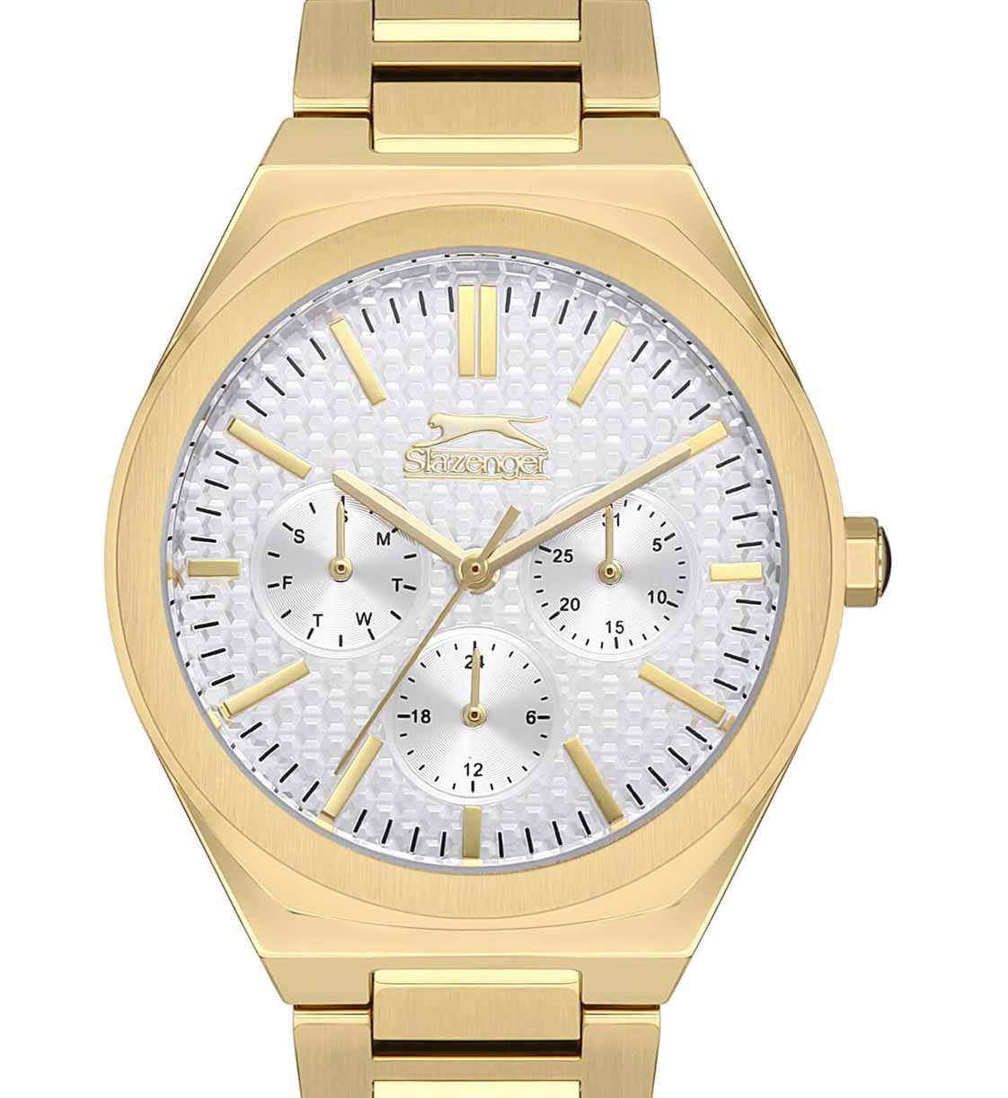 Элегантные женские часы Slazenger SL.09.2138.4.02 воплощают в себе утонченный стиль и функциональность. Их изящный круглый корпус из суперметалла с золотистым IP-покрытиемIP-покрытиеМетод ионного напыления. Демонстрирует повышенную устойчивость к истиранию, окислению и химическим веществам. Под воздействием высокого давления и температуры около 1500°C молекулы металла надёжно соединяются с частицами корпуса часов. гармонично сочетается с изысканным белым циферблатом, создавая неповторимый образ. Минималистичный дизайн подчеркивает чистоту линий и внимание к деталям. Циферблат защищен минеральным стекломМинеральное стеклоМинеральное стекло представляет собой искусственно выращенный минерал кварца. Такое стекло отличается особой устойчивостью к повреждениям и царапинам. Уступает по некоторым качествам сапфировому стеклу., устойчивым к царапинам. Часы имеют надежный кварцевый механизм, обеспечивающий точность хода.  Часы оснащены  24-часовым указателем времени, а также дней недели и даты - на дополнительных малых циферблатах. Золотистый браслет из суперметалла IP-покрытиемIP-покрытиеМетод ионного напыления. Демонстрирует повышенную устойчивость к истиранию, окислению и химическим веществам. Под воздействием высокого давления и температуры около 1500°C молекулы металла надёжно соединяются с частицами корпуса часов. идеально облегает запястье. Модель прекрасно дополнит как деловой, так и повседневный образ, став незаменимым аксессуаром для современной женщины, ценящей качество и стиль.