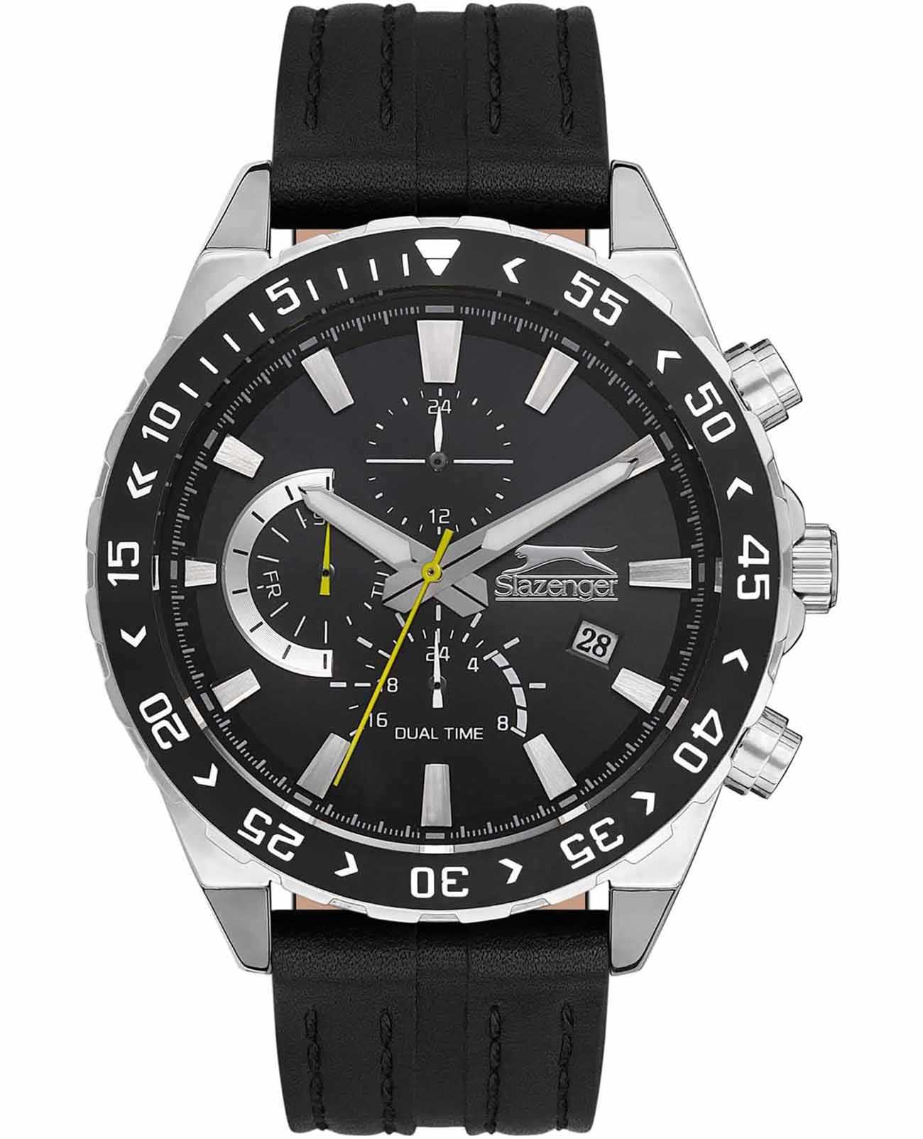 Slazenger SL.09.2152.2.01 – это великолепное сочетание стиля и функциональности, созданное для тех, кто ценит элегантность и надежность. Эти наручные часы работают на кварцевом механизме, обеспечивая точность и долговечность. Корпус выполнен из прочного суперметалла, а безельБезельВнешний ободок, закрепляющий стекло. В спортивных часах так называется поворотное кольцо с делениями на циферблате, выполняет роль таймера – замеряет отрезки времени на шкале. Неподвижный безель – элемент декора. Однонаправленно вращающийся безель на дайверских часах позволяет фиксировать моменты погружения и выныривания на поверхность. из суперметалла с черным IP-покрытиемIP-покрытиеМетод ионного напыления. Демонстрирует повышенную устойчивость к истиранию, окислению и химическим веществам. Под воздействием высокого давления и температуры около 1500°C молекулы металла надёжно соединяются с частицами корпуса часов., что придает часам современный и утонченный вид. Черный циферблат, оформленный в технике Sunray, украшен логотипом бренда и часовыми метками в виде штрихов, что добавляет аксессуару изысканности. Особенностью данной модели является наличие календаря, отображающего дату и день недели, а также возможность следить за временем во втором часовом поясе. Все это удобно размещено на отдельных циферблатах, что делает использование часов максимально комфортным. Рифленая заводная головка снабжена защитой, что обеспечивает дополнительную надежность. Часы также обладают водозащитой на уровне 50WR, что позволяет им выдерживать воздействие воды в повседневных ситуациях. Минеральное стеклоМинеральное стеклоМинеральное стекло представляет собой искусственно выращенный минерал кварца. Такое стекло отличается особой устойчивостью к повреждениям и царапинам. Уступает по некоторым качествам сапфировому стеклу. защищает циферблат от царапин и повреждений, сохраняя его внешний вид безупречным. Люминесцентное покрытиеЛюминесцентное покрытиеПозволяет считывать показания времени в темноте. Производители наносят на стрелки, часовые индексы, безель или поверхность циферблата светонакопительный состав, дающий холодное свечение. на стрелках обеспечивает отличную видимость в темноте. Завершающим штрихом образа является кожаный ремешок с классической застежкой, который обеспечивает удобную посадку на запястье и добавляет модели роскошный акцент.