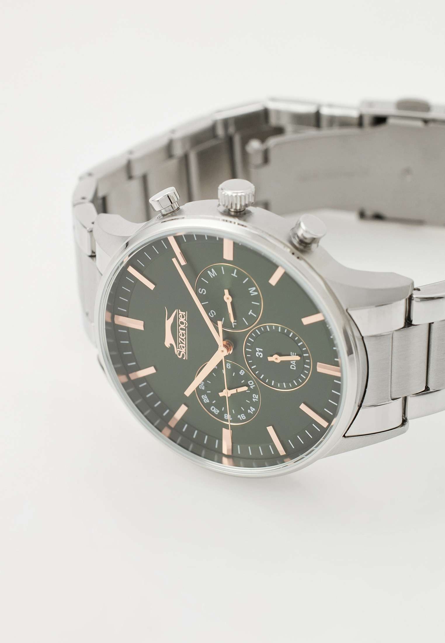 Часы Slazenger SL.09.2214.2.04 — это стильный и функциональный аксессуар для мужчин, который сочетает в себе классический британский дизайн и современные технологии. Эти часы оснащены кварцевым механизмом, обеспечивающим точность и надежность работы. Корпус из металла диаметром 44 мм и толщиной 11 мм придаёт модели прочность и элегантность, а минеральное стеклоМинеральное стеклоМинеральное стекло представляет собой искусственно выращенный минерал кварца. Такое стекло отличается особой устойчивостью к повреждениям и царапинам. Уступает по некоторым качествам сапфировому стеклу. защищает зеленый циферблат от царапин и повреждений. Серебристый металлический браслет с шириной 22 мм дополняет общий стиль часов, обеспечивая комфорт и надежность при ношении. Раскладная застёжкаРаскладная застёжкаТакой тип застёжки используется только на браслетах из металла. Она никогда не раскрывается полностью, происходит разделение на 2 и более частей. Раскладывающая застёжка снизит вероятность потери часов к минимуму. позволяет легко и удобно надевать и снимать часы. Уровень водозащиты WR 50 позволяет не беспокоиться о воздействии влаги, что делает эту модель подходящей для повседневного использования. Особенностью данной модели является наличие дополнительных функций: отображение даты и дня недели, а также текущего времени в 24-часовом формате на малых циферблатах. Это делает часы не только стильным, но и практичным аксессуаром.