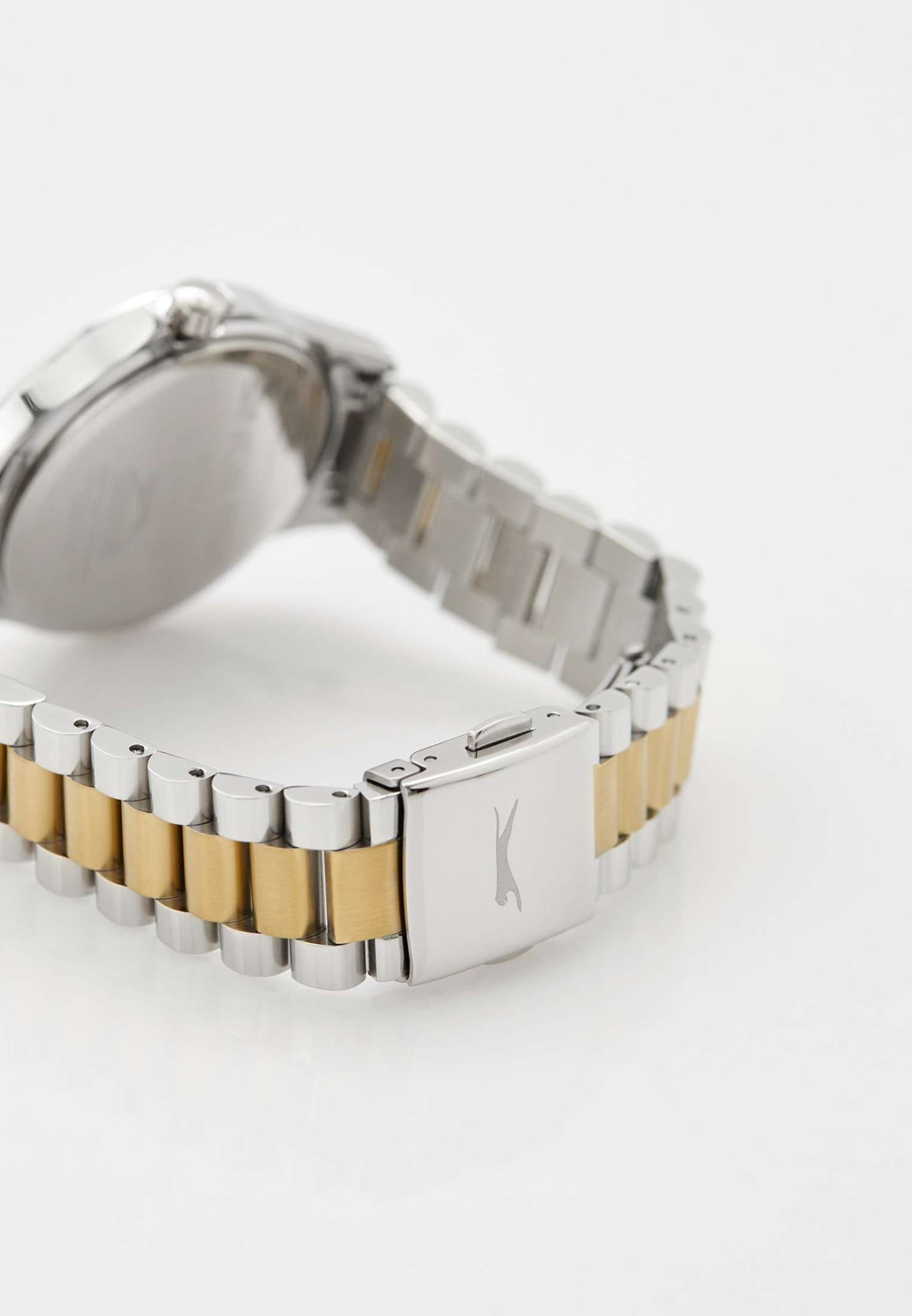 Эти женские часы Slazenger SL.09.2241.4.02 выполнены в современном стиле и станет элегантным дополнением к любому образу. Корпус и браслет изготовлены из прочного металла серебристого цвета, безельБезельВнешний ободок, закрепляющий стекло. В спортивных часах так называется поворотное кольцо с делениями на циферблате, выполняет роль таймера – замеряет отрезки времени на шкале. Неподвижный безель – элемент декора. Однонаправленно вращающийся безель на дайверских часах позволяет фиксировать моменты погружения и выныривания на поверхность. украшен изящными кристаллами, которые придают часам особую привлекательность. На циферблате расположены дополнительные малые циферблаты для отображения даты, дня недели и времени в 24-часовом формате, что делает их функциональными и удобными для ежедневного использования. Минеральное стеклоМинеральное стеклоМинеральное стекло представляет собой искусственно выращенный минерал кварца. Такое стекло отличается особой устойчивостью к повреждениям и царапинам. Уступает по некоторым качествам сапфировому стеклу. надежно защищает циферблат от царапин, а водозащита уровня WR 30 предохраняет механизм от случайных брызг воды. Заводная головка оснащена защитой, а стрелки имеют подсветку для легкого считывания времени в темноте. Диаметр корпуса составляет 34 мм, ширина браслета — 16 мм, толщина корпуса — 9 мм. Часы фиксируются на руке с помощью браслета из металла с частичным розово-золотистым IP-покрытиемIP-покрытиеМетод ионного напыления. Демонстрирует повышенную устойчивость к истиранию, окислению и химическим веществам. Под воздействием высокого давления и температуры около 1500°C молекулы металла надёжно соединяются с частицами корпуса часов. удобной раскладной застёжкиРаскладная застёжкаТакой тип застёжки используется только на браслетах из металла. Она никогда не раскрывается полностью, происходит разделение на 2 и более частей. Раскладывающая застёжка снизит вероятность потери часов к минимуму.. Вес изделия подобран для комфортной ежедневной носки. Для удобства использования в темное время суток предусмотрено люминесцентное покрытиеЛюминесцентное покрытиеПозволяет считывать показания времени в темноте. Производители наносят на стрелки, часовые индексы, безель или поверхность циферблата светонакопительный состав, дающий холодное свечение. стрелок.
