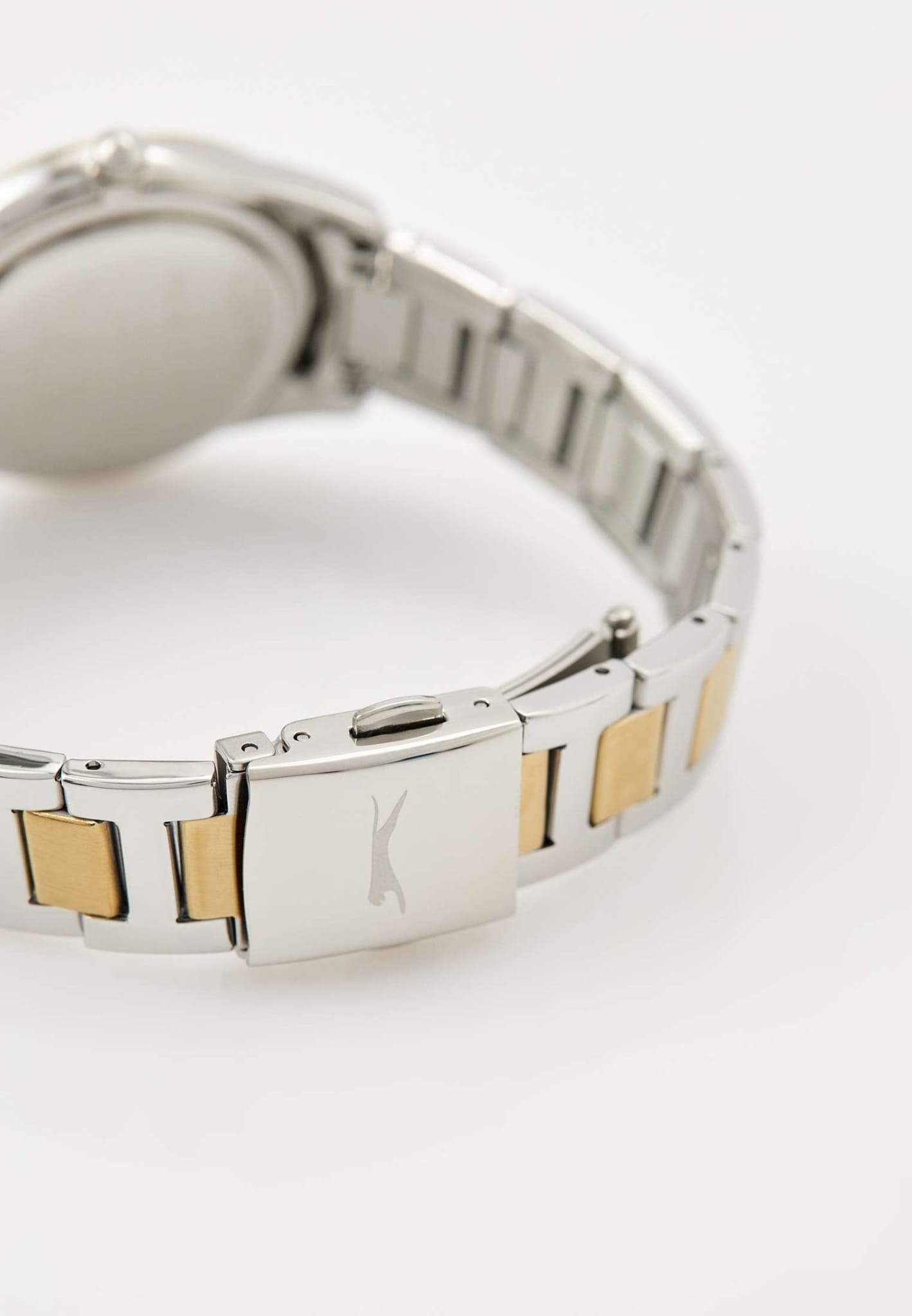Часы Slazenger SL.09.2253.3.02 — это стильная и элегантная модель, созданная для тех, кто ценит утонченность и надежность. Корпус выполнен из прочного металла, а изящный серебристый браслет с частичным золотистым IP-покрытиемIP-покрытиеМетод ионного напыления. Демонстрирует повышенную устойчивость к истиранию, окислению и химическим веществам. Под воздействием высокого давления и температуры около 1500°C молекулы металла надёжно соединяются с частицами корпуса часов. оснащен удобной раскладной застёжкойРаскладная застёжкаТакой тип застёжки используется только на браслетах из металла. Она никогда не раскрывается полностью, происходит разделение на 2 и более частей. Раскладывающая застёжка снизит вероятность потери часов к минимуму.. На безельБезельВнешний ободок, закрепляющий стекло. В спортивных часах так называется поворотное кольцо с делениями на циферблате, выполняет роль таймера – замеряет отрезки времени на шкале. Неподвижный безель – элемент декора. Однонаправленно вращающийся безель на дайверских часах позволяет фиксировать моменты погружения и выныривания на поверхность. нанесено золотистое IP-покрытиеIP-покрытиеМетод ионного напыления. Демонстрирует повышенную устойчивость к истиранию, окислению и химическим веществам. Под воздействием высокого давления и температуры около 1500°C молекулы металла надёжно соединяются с частицами корпуса часов.. Минеральное стеклоМинеральное стеклоМинеральное стекло представляет собой искусственно выращенный минерал кварца. Такое стекло отличается особой устойчивостью к повреждениям и царапинам. Уступает по некоторым качествам сапфировому стеклу. защищает серебристый циферблат, украшенный сияющими кристаллами, придающими аксессуару особый шарм. Кварцевый механизм обеспечивает точность хода, а водозащита класса WR 30 позволяет не беспокоиться о случайных брызгах. Диаметр корпуса составляет 33 мм, ширина браслета — 16 мм, толщина корпуса — 8 мм, что делает эти часы аккуратными и комфортными для повседневной носки. Модель весит 70 грамм. Часы прекрасно дополнят как деловой, так и повседневный образ, подчеркивая индивидуальность своей обладательницы.