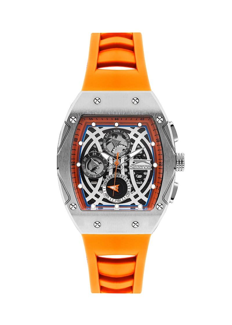 Часы Slazenger SL.09.2257.2.04 — это современная модель, сочетающая стильный внешний вид и функциональность. Крупный корпус размером 44х53 мм выполнен из металла, что придает часам выразительный характер и надежную защиту от внешних воздействий. Сатинированный безельБезельВнешний ободок, закрепляющий стекло. В спортивных часах так называется поворотное кольцо с делениями на циферблате, выполняет роль таймера – замеряет отрезки времени на шкале. Неподвижный безель – элемент декора. Однонаправленно вращающийся безель на дайверских часах позволяет фиксировать моменты погружения и выныривания на поверхность. гармонично сочетается с серебристым циферблатом, украшенным логотипом бренда и аккуратными часовыми метками в виде точек. Минеральное стеклоМинеральное стеклоМинеральное стекло представляет собой искусственно выращенный минерал кварца. Такое стекло отличается особой устойчивостью к повреждениям и царапинам. Уступает по некоторым качествам сапфировому стеклу. обеспечивает защиту от случайных царапин, а стрелки и метки с люминесцентным покрытиемЛюминесцентное покрытиеПозволяет считывать показания времени в темноте. Производители наносят на стрелки, часовые индексы, безель или поверхность циферблата светонакопительный состав, дающий холодное свечение. удобно подсвечиваются в темноте после зарядки на свету. На циферблате расположены отдельные индикаторы даты, дня недели, а также 12- и 24-часового формата времени. За точность хода отвечает кварцевый механизм, не требующий ежедневного завода. Модель снабжена оранжевым силиконовым ремешком шириной 26 мм с классической застежкой, который комфортно фиксируется на запястье и подходит для активного образа жизни. Водозащита 50WR позволяет не снимать часы при мытье рук или во время прогулок под дождем.