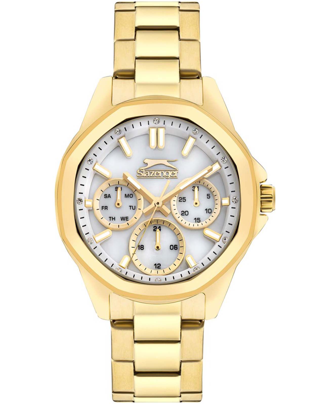 Часы Slazenger SL.09.2290.4.08 — это сочетание современного дизайна и функциональности, идеально подходящее для тех, кто ценит стиль и элегантность. Корпус и браслет выполнены из прочного суперметалла с золотистым IP-покрытиемIP-покрытиеМетод ионного напыления. Демонстрирует повышенную устойчивость к истиранию, окислению и химическим веществам. Под воздействием высокого давления и температуры около 1500°C молекулы металла надёжно соединяются с частицами корпуса часов., что придаёт модели солидный и эффектный вид. Белый циферблат с лаконичными отметками, кристаллами и фирменным логотипом защищён устойчивым к царапинам минеральным стекломМинеральное стеклоМинеральное стекло представляет собой искусственно выращенный минерал кварца. Такое стекло отличается особой устойчивостью к повреждениям и царапинам. Уступает по некоторым качествам сапфировому стеклу.. Дополнительные функции включают отображение даты и дня недели, а также 12- и 24-часовой формат времени на отдельных мини-циферблатах, что делает использование часов максимально удобным. Заводная головка оснащена защитой, а надёжная раскладная застёжкаРаскладная застёжкаТакой тип застёжки используется только на браслетах из металла. Она никогда не раскрывается полностью, происходит разделение на 2 и более частей. Раскладывающая застёжка снизит вероятность потери часов к минимуму. обеспечивает комфортную посадку на запястье. Особое внимание привлекает восьмигранный безельБезельВнешний ободок, закрепляющий стекло. В спортивных часах так называется поворотное кольцо с делениями на циферблате, выполняет роль таймера – замеряет отрезки времени на шкале. Неподвижный безель – элемент декора. Однонаправленно вращающийся безель на дайверских часах позволяет фиксировать моменты погружения и выныривания на поверхность.. Циферблат оснащён люминесцентным покрытиемЛюминесцентное покрытиеПозволяет считывать показания времени в темноте. Производители наносят на стрелки, часовые индексы, безель или поверхность циферблата светонакопительный состав, дающий холодное свечение. стрелок и меток, что позволяет легко определять время даже в условиях плохой освещенности. Водозащита 30WR позволяет не беспокоиться о случайных брызгах и дождевых каплях. Диаметр корпуса составляет 36 мм, толщина — 12 мм, вес — 97 г, благодаря чему часы выглядят внушительно и подчёркивают индивидуальный стиль владельца. Эта модель станет отличным акцентом в вашем образе и подчеркнёт вашу уверенность в любой ситуации.