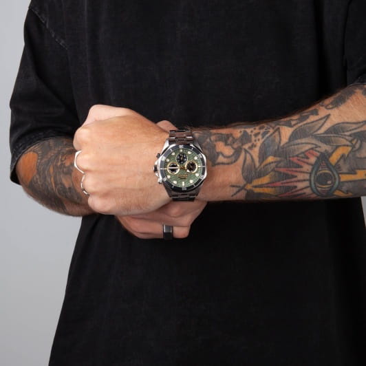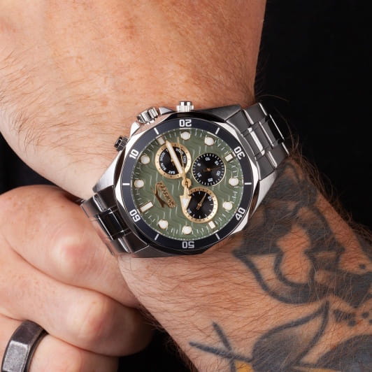 Мужские кварцевые часы Slazenger SL.09.2309.2.06 — это выразительный и функциональный аксессуар, сочетающий прочность, стиль и насыщенную комплектацию. Корпус и браслет выполнены из суперметалла, защищён минеральным стекломМинеральное стеклоМинеральное стекло представляет собой искусственно выращенный минерал кварца. Такое стекло отличается особой устойчивостью к повреждениям и царапинам. Уступает по некоторым качествам сапфировому стеклу.. Циферблат зелёного цвета оформлен с вынесенными малыми циферблатами для индикации дня недели, даты и времени в 24-часовом формате. Стрелки и метки оснащены люминесцентным покрытиемЛюминесцентное покрытиеПозволяет считывать показания времени в темноте. Производители наносят на стрелки, часовые индексы, безель или поверхность циферблата светонакопительный состав, дающий холодное свечение., обеспечивающим хорошую читаемость в темноте. Заводная головка снабжена защитой, а задняя крышка — завинчивающаяся, что повышает надёжность конструкции. Браслет из суперметалла фиксируется на раскладной застёжкеРаскладная застёжкаТакой тип застёжки используется только на браслетах из металла. Она никогда не раскрывается полностью, происходит разделение на 2 и более частей. Раскладывающая застёжка снизит вероятность потери часов к минимуму., обеспечивая удобство и безопасность ношения. Водонепроницаемость 50 м позволяет использовать часы в повседневных условиях, защищая от случайных брызг и капель дождя. Модель подчёркивает индивидуальность владельца и идеально подходит как для повседневного, так и для делового образа.