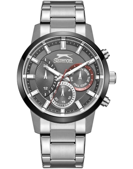 Slazenger (SL.09.2372.2.01) — стильные мужские часы, сочетающие современный дизайн и функциональность. Корпус выполнен из суперметалла, придающей модели прочность и долговечность. Минеральное стеклоМинеральное стеклоМинеральное стекло представляет собой искусственно выращенный минерал кварца. Такое стекло отличается особой устойчивостью к повреждениям и царапинам. Уступает по некоторым качествам сапфировому стеклу. защищает циферблат от царапин и гарантирует превосходную читаемость. БезельБезельВнешний ободок, закрепляющий стекло. В спортивных часах так называется поворотное кольцо с делениями на циферблате, выполняет роль таймера – замеряет отрезки времени на шкале. Неподвижный безель – элемент декора. Однонаправленно вращающийся безель на дайверских часах позволяет фиксировать моменты погружения и выныривания на поверхность. с PVD-покрытиемPVDУльтратонкое покрытие наносится в технике вакуумного напыления, сочетает в себе нитрид титана особой прочности со слоем золота или оксида хрома. Несёт в себе декоративную или защитную функцию.. Циферблат с серебристыми метками и стрелками подчёркивает элегантный стиль. Браслет из суперметалла обеспечивает комфортное ношение и надёжную фиксацию на запястье. Функциональность дополняется многофункциональным дисплеем с индикацией даты, дня недели и 24-часового формата времени. Водонепроницаемость 50 метров делает модель устойчивой к случайным брызгам, идеально подходя для повседневного использования.