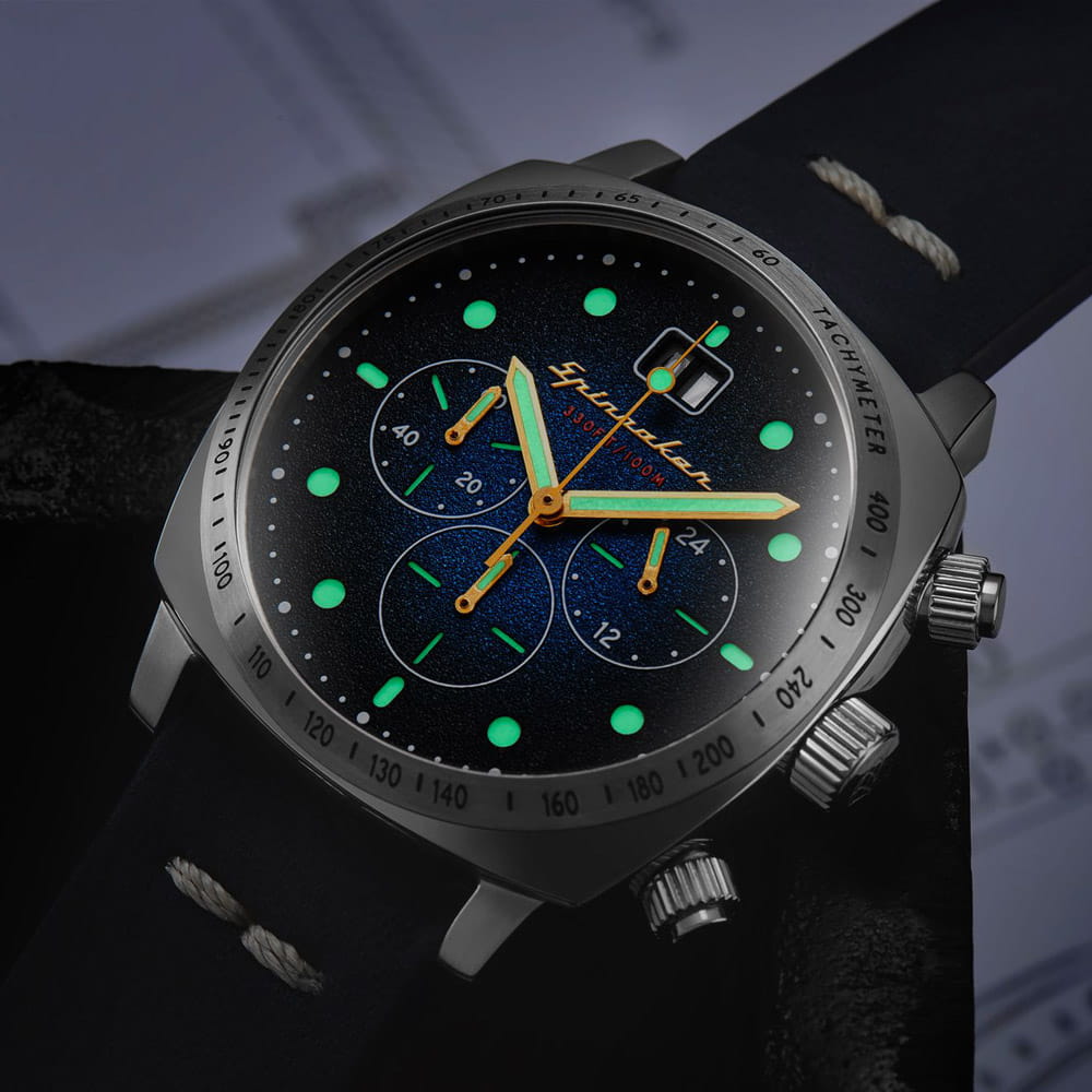 Мужской кварцевый хронографХронографФункция позволяет измерять отрезки времени с особой точностью: часы, минуты, секунды. Верным признаком хронографа является наличие на циферблате 3 дополнительных окошек-счётчиков. с секундомеромСекундомерСекундоме́р — прибор, способный измерять интервалы времени с точностью до долей секунды. и тахиметромТахиметрРазмеченная шкала, располагается на ободке или безеле часов. Тахиметр позволяет рассчитать скорость на определённом участке пути, расстояние измеряется в километрах или милях. Spinnaker Hull SP-5068-03. Калибр механизма TMI VK73. Центральные часовая и минутная стрелки, секундная стрелка вынесена на малый циферблат. Большая дата в позиции 12 часов. 12/24х часовой формат времени. Корпус выполнен из нержавеющей стали. Кожаный ремешок шириной 22 мм, стандартная застежка. Циферблат с люминесцентным покрытиемЛюминесцентное покрытиеПозволяет считывать показания времени в темноте. Производители наносят на стрелки, часовые индексы, безель или поверхность циферблата светонакопительный состав, дающий холодное свечение. стрелок и меток, дополнен выпуклым минеральным стекломМинеральное стеклоМинеральное стекло представляет собой искусственно выращенный минерал кварца. Такое стекло отличается особой устойчивостью к повреждениям и царапинам. Уступает по некоторым качествам сапфировому стеклу. , устойчивым к мелким механическим повреждениям. Водостойкость WR 100 (плавание без погружения).