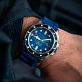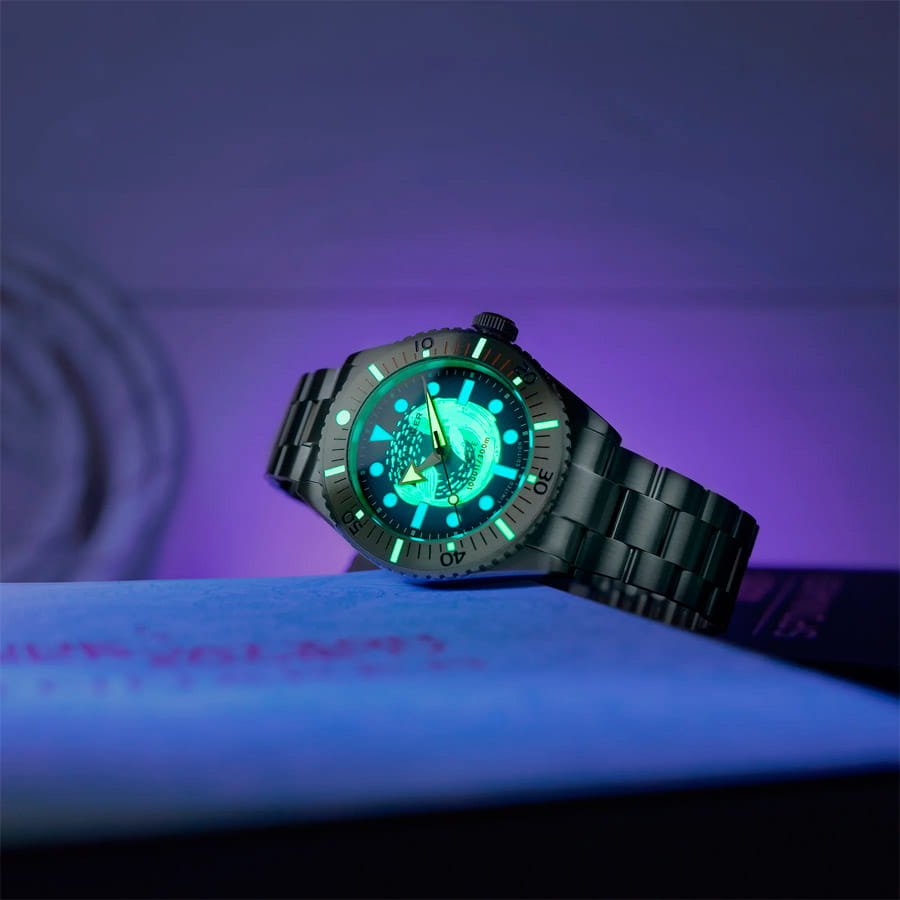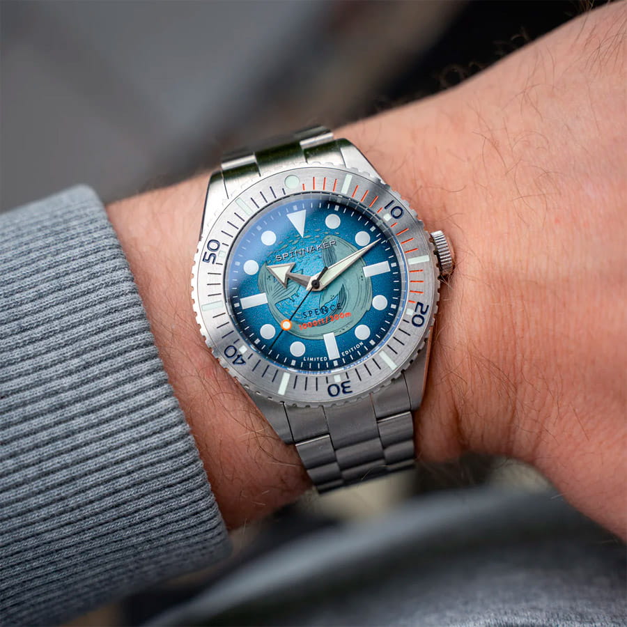 Мужские итальянские часы Spinnaker Spence SP-5124-11 из лимитированной серии (300 экземпляров). Механические часы с автоподзаводом. Циферблат с люминесцентным покрытиемЛюминесцентное покрытиеПозволяет считывать показания времени в темноте. Производители наносят на стрелки, часовые индексы, безель или поверхность циферблата светонакопительный состав, дающий холодное свечение. стрелок, меток и безеля дополнен сапфировым стекломСапфировое стеклоПрочный и надёжный материал из кристалла сапфира синтетического происхождения, характеризующийся особой твёрдостью и устойчивостью к царапинам и повреждениям. с антибликовым покрытиемАнтибликовое покрытиеСлой оксида металла в 0,13-0,3 микрон, благодаря которому стекло часов не бликует и не отражает свет. Антибликовое покрытие уменьшает отражение света в 10 раз, обеспечивая отличную читаемость показателей циферблата., устойчивым к появлению царапин и обладающее высокой прозрачностью. Класс водозащиты: 300 метров, позволит плавать, нырять и заниматься другими водными видами спорта. Корпус часов изготовлен из нержавеющей стали с поворотным безелемБезельВнешний ободок, закрепляющий стекло. В спортивных часах так называется поворотное кольцо с делениями на циферблате, выполняет роль таймера – замеряет отрезки времени на шкале. Неподвижный безель – элемент декора. Однонаправленно вращающийся безель на дайверских часах позволяет фиксировать моменты погружения и выныривания на поверхность. . Браслет выполнен из нержавеющей стали на раскладной застёжкеРаскладная застёжкаТакой тип застёжки используется только на браслетах из металла. Она никогда не раскрывается полностью, происходит разделение на 2 и более частей. Раскладывающая застёжка снизит вероятность потери часов к минимуму.. Ширина браслета 20 мм. В комплекте дополнительный нейлоновый ремешок синего цвета.