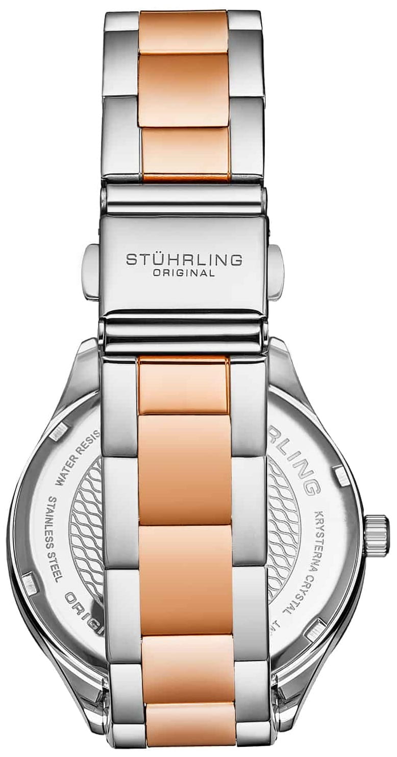 Stuhrling 4019.3 — утончённые женские часы, воплощающие романтику и изысканность в каждой линии. Корпус из нержавеющей стали. БезельБезельВнешний ободок, закрепляющий стекло. В спортивных часах так называется поворотное кольцо с делениями на циферблате, выполняет роль таймера – замеряет отрезки времени на шкале. Неподвижный безель – элемент декора. Однонаправленно вращающийся безель на дайверских часах позволяет фиксировать моменты погружения и выныривания на поверхность. с PVD-покрытиемPVDУльтратонкое покрытие наносится в технике вакуумного напыления, сочетает в себе нитрид титана особой прочности со слоем золота или оксида хрома. Несёт в себе декоративную или защитную функцию. украшен сияющими кристаллами, подчёркивающими женственный блеск модели. Переливчатый циферблат из перламутра с фигурным вырезом в форме сердца создаёт чарующий эффект и делает дизайн по-настоящему уникальным. Стрелки и римские метки выделяются на фоне глубокого синего оттенка, а стекло KrysternaKrysternaKrysterna — инновационное стекло для наручных часов. Благодаря уникальной структуре, Krysterna объединяет ключевые преимущества двух материалов: твердость сапфира, защищающую от царапин, и гибкость минерального стекла, обеспечивающую устойчивость к деформациям. Такая комбинация делает его идеальным решением для часов, подверженных экстремальным нагрузкам, сохраняя при этом оптическую прозрачность. надёжно защищает поверхность от царапин. Стальной браслет с частичным PVD-покрытиемPVDУльтратонкое покрытие наносится в технике вакуумного напыления, сочетает в себе нитрид титана особой прочности со слоем золота или оксида хрома. Несёт в себе декоративную или защитную функцию. и раскладной застёжкойРаскладная застёжкаТакой тип застёжки используется только на браслетах из металла. Она никогда не раскрывается полностью, происходит разделение на 2 и более частей. Раскладывающая застёжка снизит вероятность потери часов к минимуму. обеспечивает удобную посадку и завершает изысканный облик. Stuhrling — это часы, которые подчеркивают элегантность, чувственность и уверенность своей обладательницы.