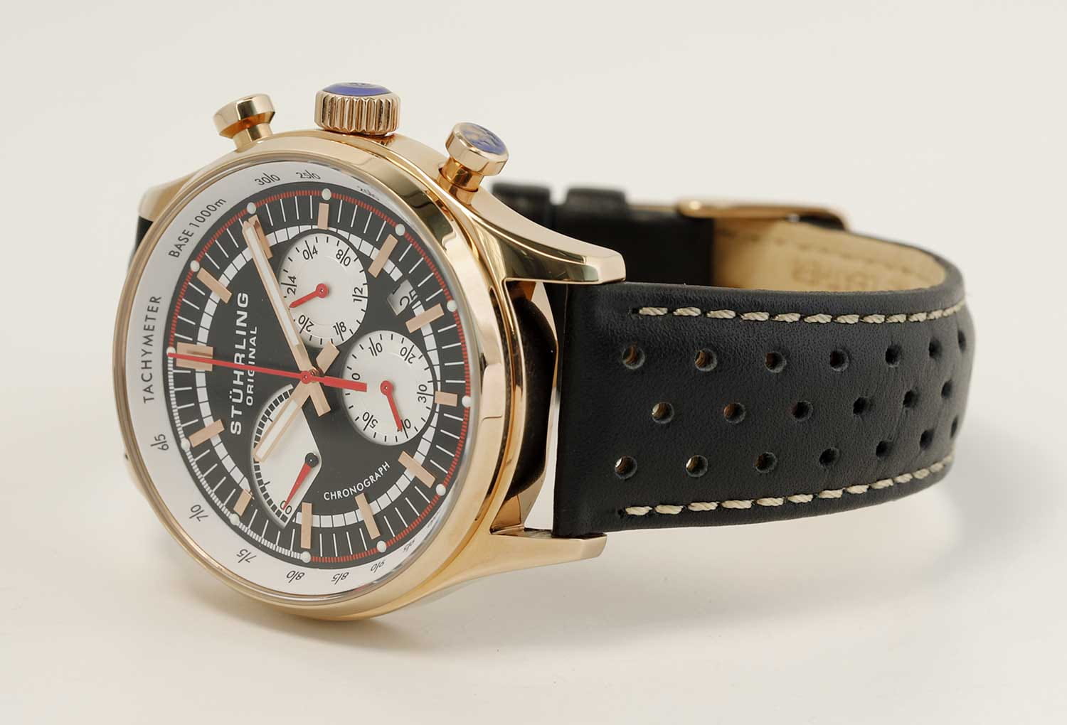 Stuhrling 934.03 — эффектные мужские часы в спортивно-классическом стиле, сочетающие энергичный характер и элегантное исполнение. Корпус с изысканным PVD-покрытиемPVDУльтратонкое покрытие наносится в технике вакуумного напыления, сочетает в себе нитрид титана особой прочности со слоем золота или оксида хрома. Несёт в себе декоративную или защитную функцию. цвета розового золота придаёт модели выразительность и статусный вид. Контрастный чёрный циферблат с белыми счётчиками хронографаХронографФункция позволяет измерять отрезки времени с особой точностью: часы, минуты, секунды. Верным признаком хронографа является наличие на циферблате 3 дополнительных окошек-счётчиков. и акцентами красного цвета создаёт динамичную композицию, а разметка тахиметра добавляет функциональности. Прочное стекло KrysternaKrysternaKrysterna — инновационное стекло для наручных часов. Благодаря уникальной структуре, Krysterna объединяет ключевые преимущества двух материалов: твердость сапфира, защищающую от царапин, и гибкость минерального стекла, обеспечивающую устойчивость к деформациям. Такая комбинация делает его идеальным решением для часов, подверженных экстремальным нагрузкам, сохраняя при этом оптическую прозрачность. защищает поверхность от царапин, сохраняя прозрачность и блеск. Перфорированный кожаный ремень со стандартной застежкой обеспечивает комфорт и спортивный характер образа. Stuhrling — выбор уверенного мужчины, для которого стиль, точность и мощная эстетика идут рука об руку.