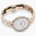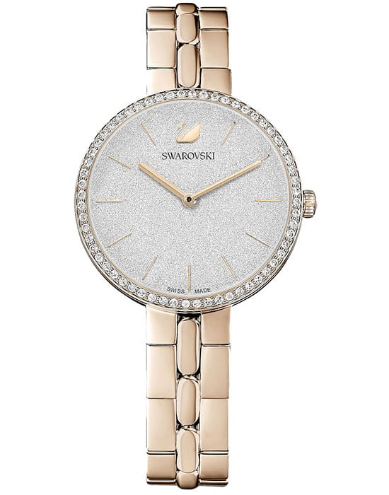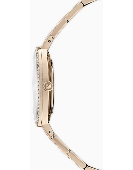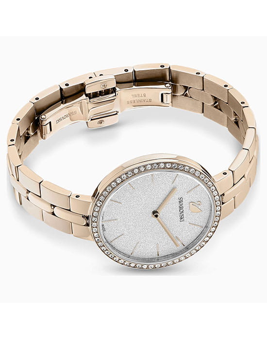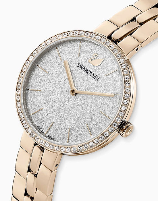 Сверкающий белый циферблат с изящными золотистыми метками и стрелками подчёркивает элегантность дизайна. Логотип Swarovski в виде лебедя расположен на отметке «12 часов».
