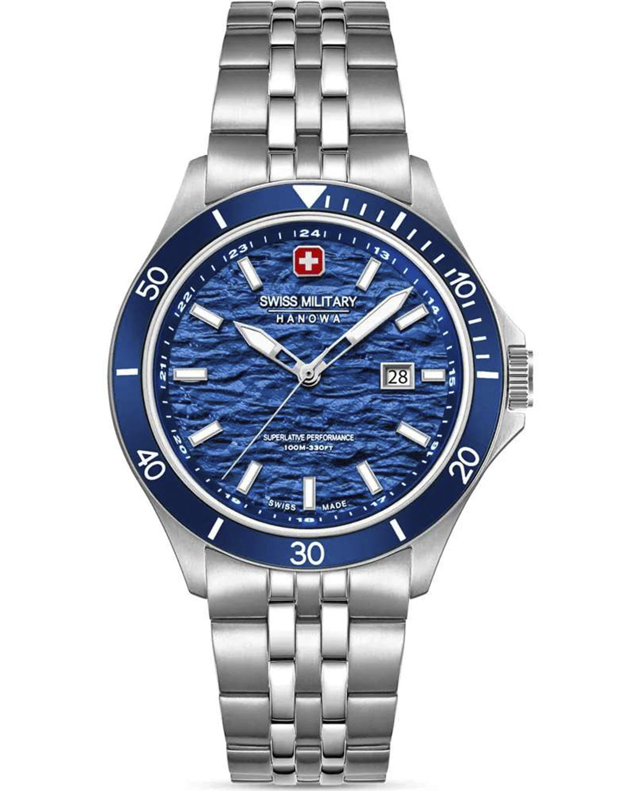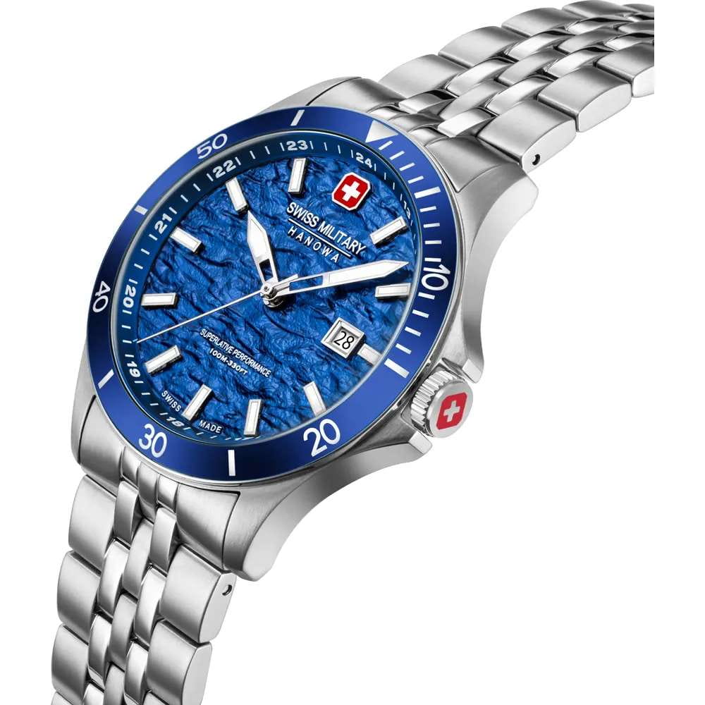 Мужские кварцевые часы Swiss Military Hanowa — швейцарская надёжность в классическом исполнении. Корпус круглый, из нержавеющей стали, диаметром 42 мм. Циферблат — синий с серебристыми стрелками. Стекло — сапфировоеСапфировое стеклоПрочный и надёжный материал из кристалла сапфира синтетического происхождения, характеризующийся особой твёрдостью и устойчивостью к царапинам и повреждениям.. Механизм — швейцарский кварцевый Ronda 505 с функцией **hack** (остановка секундной стрелки для точной настройки). БезельБезельВнешний ободок, закрепляющий стекло. В спортивных часах так называется поворотное кольцо с делениями на циферблате, выполняет роль таймера – замеряет отрезки времени на шкале. Неподвижный безель – элемент декора. Однонаправленно вращающийся безель на дайверских часах позволяет фиксировать моменты погружения и выныривания на поверхность. — неподвижный, из нержавеющей стали с IP-покрытиемIP-покрытиеМетод ионного напыления. Демонстрирует повышенную устойчивость к истиранию, окислению и химическим веществам. Под воздействием высокого давления и температуры около 1500°C молекулы металла надёжно соединяются с частицами корпуса часов.. Задняя крышка — завинчивающаяся. Водонепроницаемость 100 м. Браслет — стальной, на раскладной застёжке с кнопками и фиксаторомРаскладная застёжкаТакой тип застёжки используется только на браслетах из металла. Она никогда не раскрывается полностью, происходит разделение на 2 и более частей. Раскладывающая застёжка снизит вероятность потери часов к минимуму.. Идеальный выбор для тех, кто ценит швейцарское качество и классический стиль.