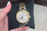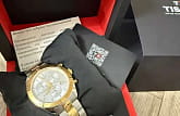Модель привлекает оригинальным внешним видом, дизайнеры умело сочетают серебристый и золотистый оттенок. Классический стиль со спортивными деталями позволяет использовать часы в качестве дополнения к любому образу. Минималистичный циферблат. Кварцевый калибр ETA G15.212 с высокой точностью хода. Водонепроницаемость до 10 бар. Функционал: хронограф, секундомер, календарь. Габариты: 38 x 38 x 10,5 мм.