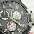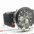 Оригинальный аксессуар в чёрно-серебряном цвете обладает характерными крупными деталями, идёт отсылка к деталям гоночных мотоциклов. Задняя крышка корпуса сделана в виде колеса, безельБезельВнешний ободок, закрепляющий стекло. В спортивных часах так называется поворотное кольцо с делениями на циферблате, выполняет роль таймера – замеряет отрезки времени на шкале. Неподвижный безель – элемент декора. Однонаправленно вращающийся безель на дайверских часах позволяет фиксировать моменты погружения и выныривания на поверхность. напоминает тормозную колодку. Наручные часы оснащены кварцевым механизмом швейцарского производства ETA G10.212. ХронографХронографФункция позволяет измерять отрезки времени с особой точностью: часы, минуты, секунды. Верным признаком хронографа является наличие на циферблате 3 дополнительных окошек-счётчиков. позволяет измерять показатели с особой точностью. Чёрное PVD-покрытиеPVDУльтратонкое покрытие наносится в технике вакуумного напыления, сочетает в себе нитрид титана особой прочности со слоем золота или оксида хрома. Несёт в себе декоративную или защитную функцию. корпуса. Сапфировое стекло. Водостойкость при давлении 10 бар. Секундомер, индикация даты. Люминесцентная подсветкаЛюминесцентное покрытиеПозволяет считывать показания времени в темноте. Производители наносят на стрелки, часовые индексы, безель или поверхность циферблата светонакопительный состав, дающий холодное свечение.. Габариты: 47,6 x 43 x 12,3 мм.