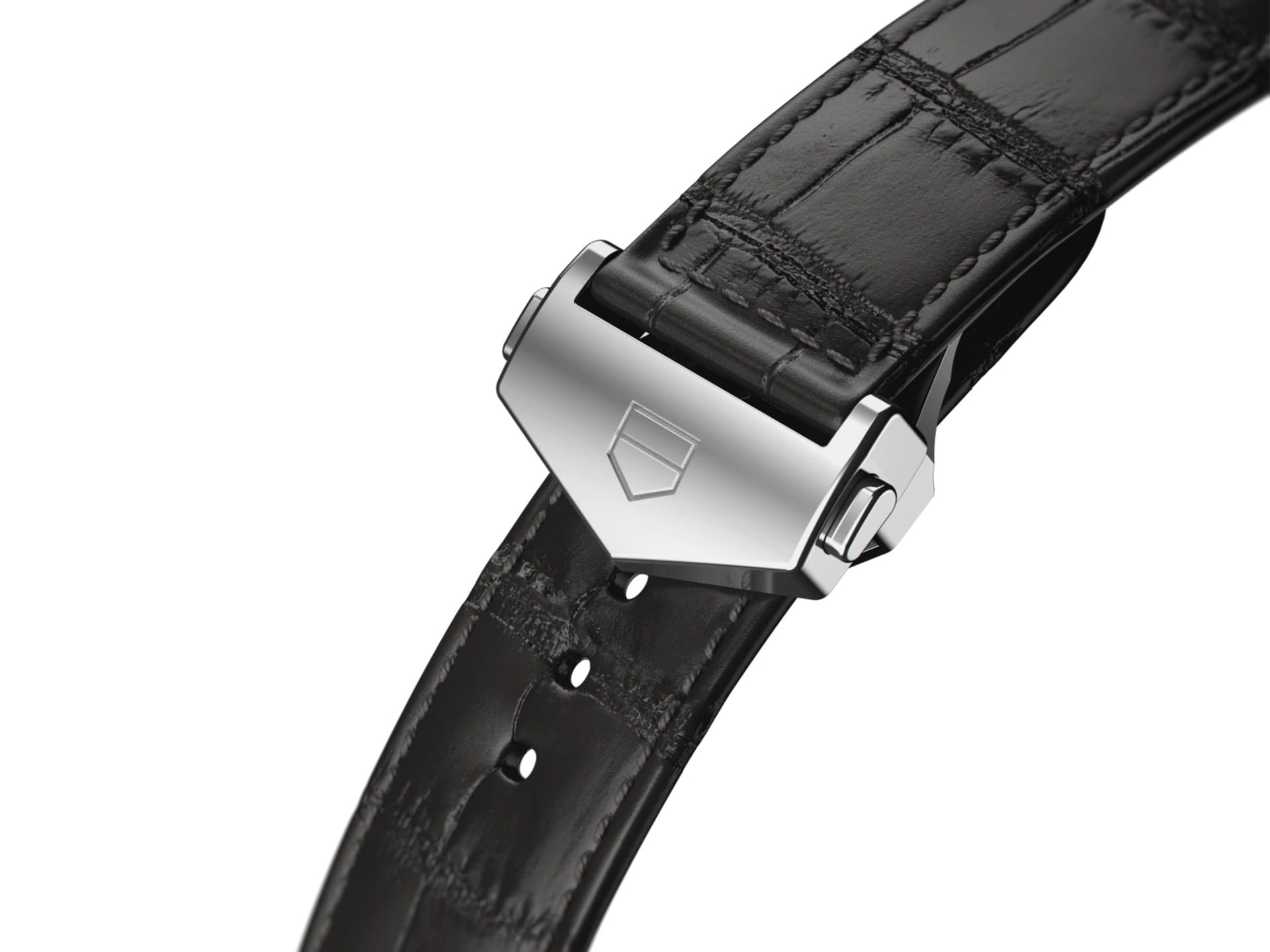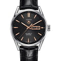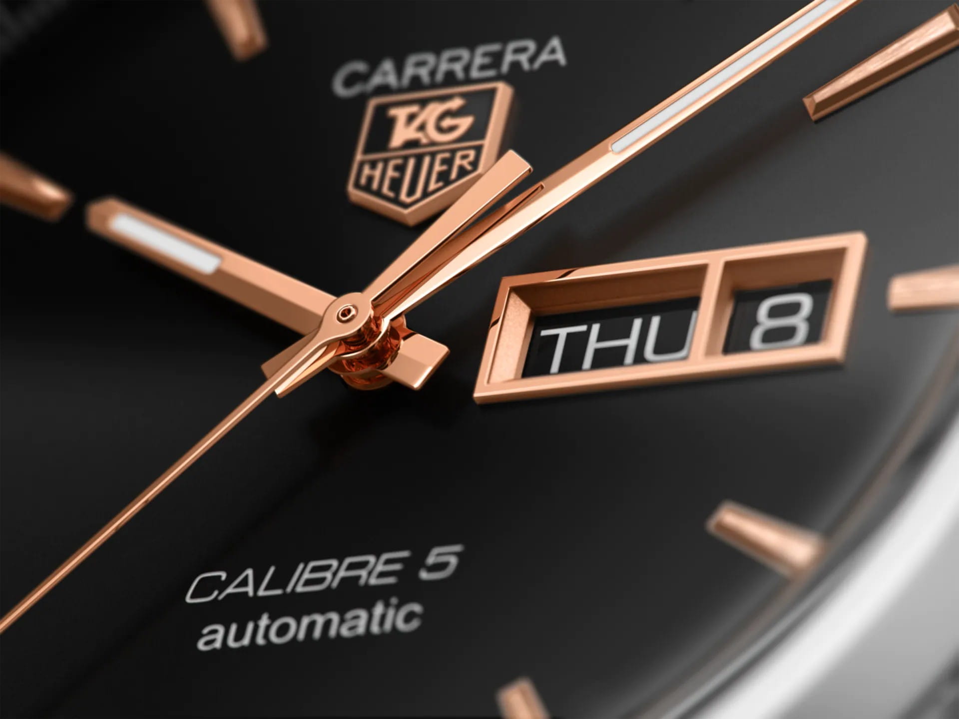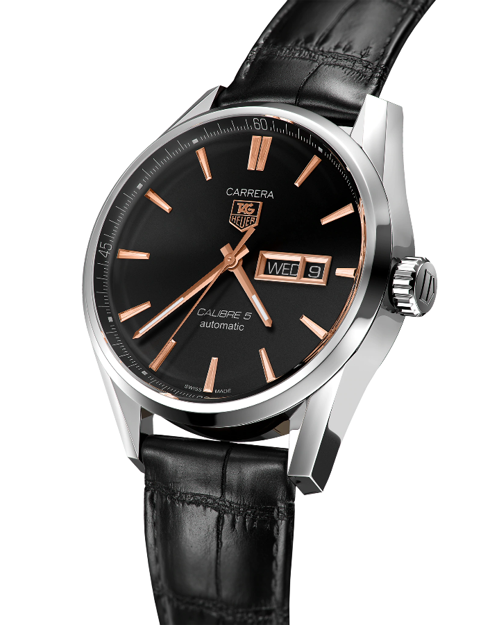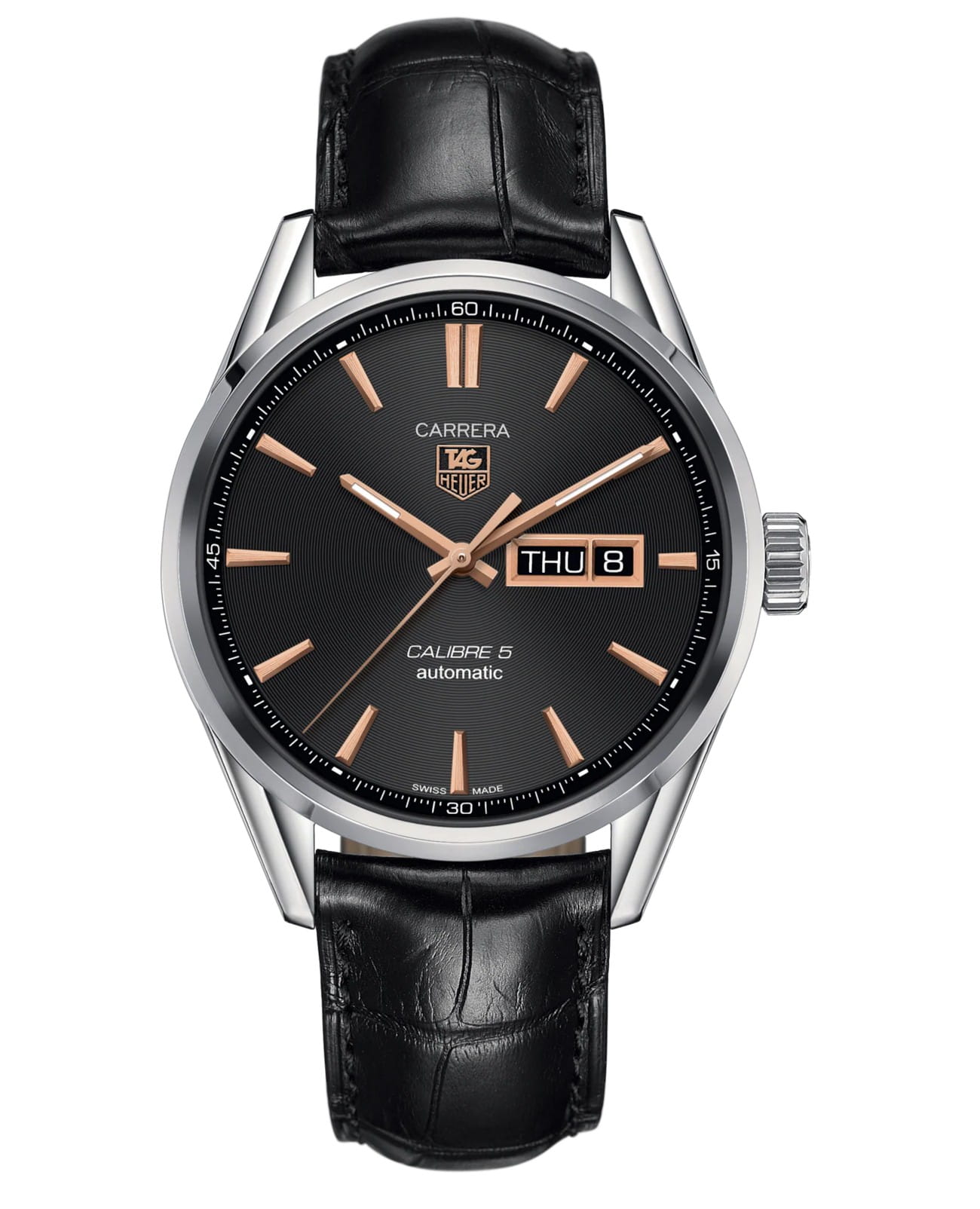 Часы с элементами из розового золота, в числе которых окошко даты и дня недели, на черном циферблате и подобранным в тон ремешком из черной кожи аллигатора. Предназначены для мужчин, живущих в ритме динамичной городской жизни. TAG Heuer Carrera WAR201C.FC6266, механический механизм (автоматический калибр) с высокой точностью. Сапфировое стекло устойчивое к появлению царапин, обладающее высокой прозрачностью. Класс водозащиты: 100 метров, позволит плавать, нырять и заниматься другими водными видами спорта. Корпус часов изготовлен из стали, цвета.