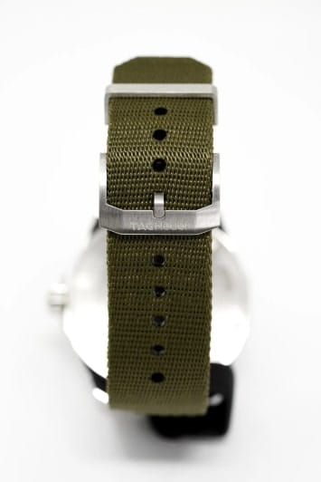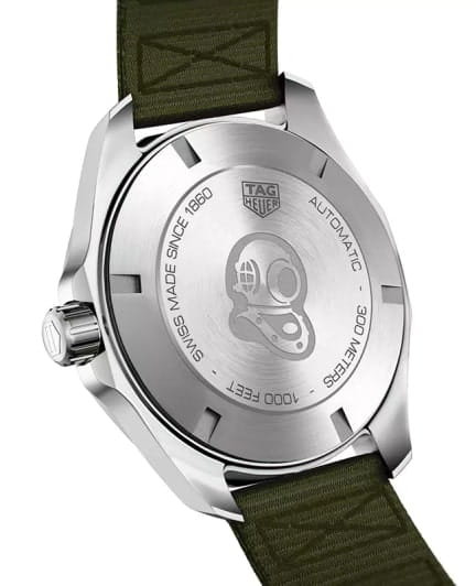 TAG Heuer Aquaracer WAY101E.FC8222 – элегантные мужские часы, сочетающие стиль и функциональность. Корпус диаметром 43 мм выполнен из нержавеющей стали с безелемБезельВнешний ободок, закрепляющий стекло. В спортивных часах так называется поворотное кольцо с делениями на циферблате, выполняет роль таймера – замеряет отрезки времени на шкале. Неподвижный безель – элемент декора. Однонаправленно вращающийся безель на дайверских часах позволяет фиксировать моменты погружения и выныривания на поверхность. из алюминия и стали с PVD-покрытиемPVDУльтратонкое покрытие наносится в технике вакуумного напыления, сочетает в себе нитрид титана особой прочности со слоем золота или оксида хрома. Несёт в себе декоративную или защитную функцию., устойчивым к царапинам. Тёмно-зелёный циферблат с солнечным узором оснащён накладными часовыми метками и стрелками с люминесцентным покрытиемЛюминесцентное покрытиеПозволяет считывать показания времени в темноте. Производители наносят на стрелки, часовые индексы, безель или поверхность циферблата светонакопительный состав, дающий холодное свечение., обеспечивающим отличную читаемость в любых условиях освещения. Часы оснащены точным кварцевым механизмом, гарантирующим надёжное отображение времени. Функциональность включает индикацию часов, минут, секунд и даты, расположенной на отметке «3 часа». Сапфировое стеклоСапфировое стеклоПрочный и надёжный материал из кристалла сапфира синтетического происхождения, характеризующийся особой твёрдостью и устойчивостью к царапинам и повреждениям. с антибликовым покрытиемАнтибликовое покрытиеСлой оксида металла в 0,13-0,3 микрон, благодаря которому стекло часов не бликует и не отражает свет. Антибликовое покрытие уменьшает отражение света в 10 раз, обеспечивая отличную читаемость показателей циферблата. обеспечивает защиту от царапин и превосходную читаемость. Тёмно-зелёный нейлоновый ремешок оснащён классической застёжкой-пряжкой из нержавеющей стали. Водозащита до 300 метров (30 бар) делает модель подходящей для дайвинга и других водных видов спорта.