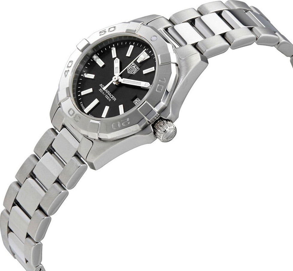 Изысканные кварцевые женские часы TAG Heuer Aquaracer WBD1410.BA0741 с большим, выразительным корпусом диаметром 27 мм из нержавеющей стали. Кварцевый механизм с высокой точностью. Сапфировое стеклоСапфировое стеклоПрочный и надёжный материал из кристалла сапфира синтетического происхождения, характеризующийся особой твёрдостью и устойчивостью к царапинам и повреждениям. устойчивое к появлению царапин, обладающее высокой прозрачностью. Класс водозащиты: 300 метров, позволит плавать, нырять и заниматься другими водными видами спорта. Корпус часов изготовлен из стали, серебристого цвета. Стрелки с люминесцентным покрытиемЛюминесцентное покрытиеПозволяет считывать показания времени в темноте. Производители наносят на стрелки, часовые индексы, безель или поверхность циферблата светонакопительный состав, дающий холодное свечение.. Стальной браслет на раскладной застёжкеРаскладная застёжкаТакой тип застёжки используется только на браслетах из металла. Она никогда не раскрывается полностью, происходит разделение на 2 и более частей. Раскладывающая застёжка снизит вероятность потери часов к минимуму..