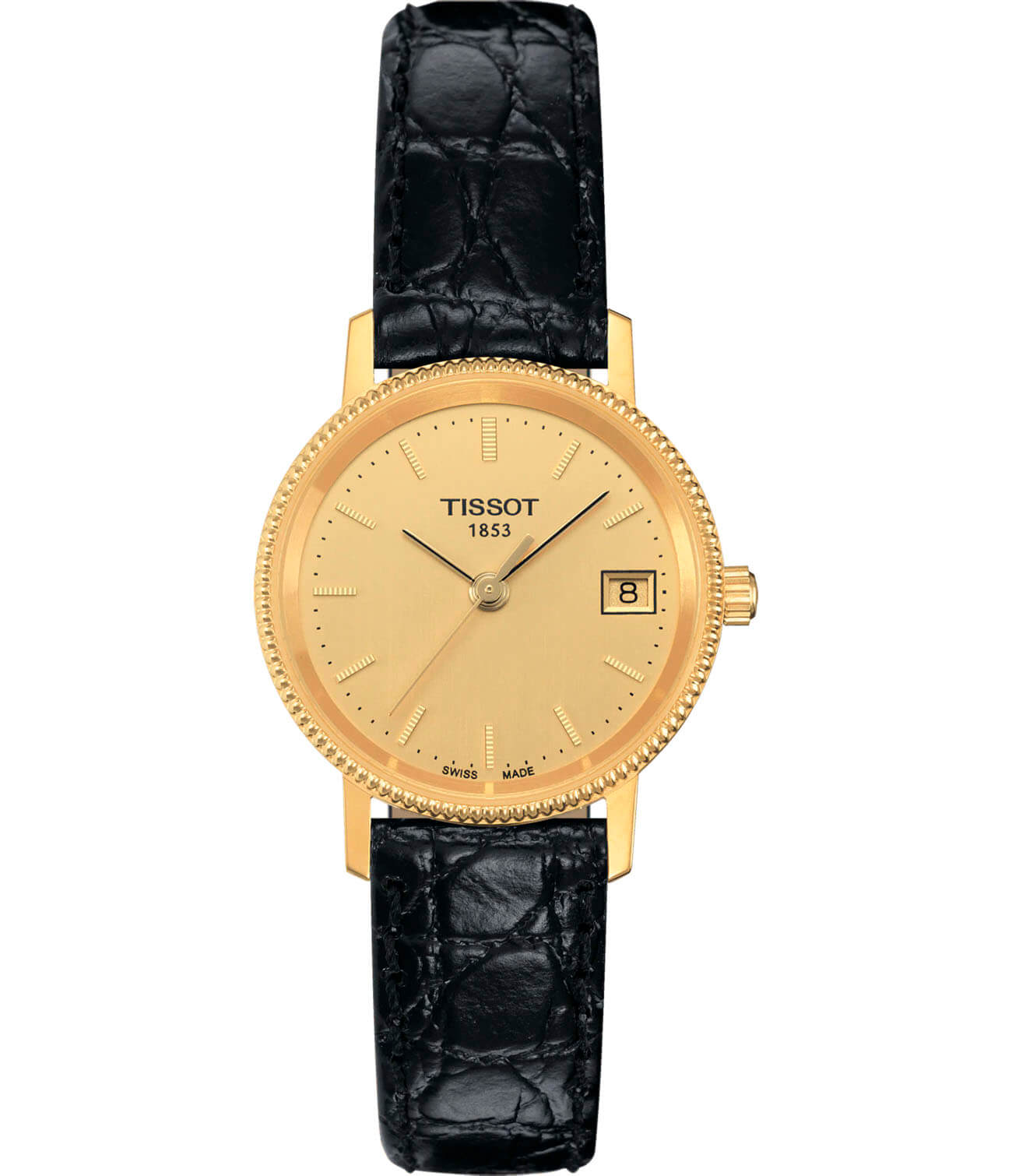 TISSOT T71311521 - женские кварцевые золотые наручные часы Корпус этих часов небольшого размера (24 мм) и выполнен из 18-каратного желтого золота Модель TISSOT T71311521 имеет устойчивое к царапинам сапфировое стекло, кожаный ремешок , цвет циферблата шампань Калибр механизма: ETA E61111 Класс водозащиты: 30 м /3 АТМ Дополнительные функции и особенности: отображение числа Полная заводская комплектация TISSOT: оригинальные часы, фирменная коробка, инструкция, сервисная книжка, роман о часовой фабрике, миникаталог, замшевый фирменный чехол черного цвета для хранения и/или переноски часов, кассовый и товарный чеки Международная гарантия 2 года Производство и сборка: Швейцария