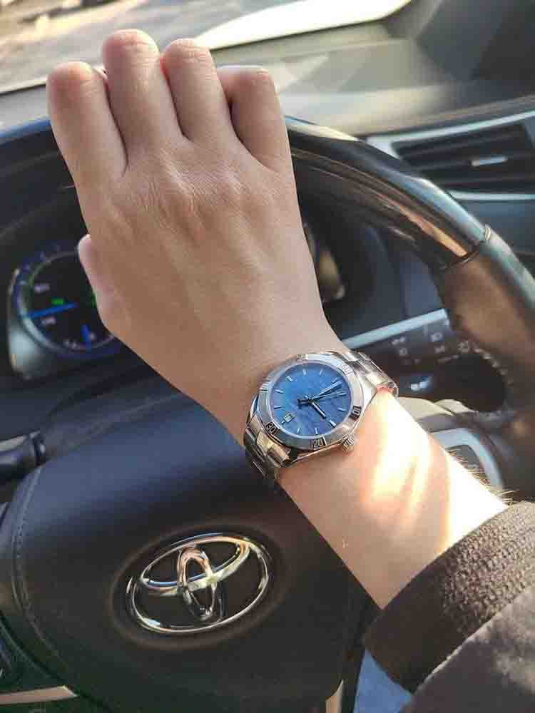 В оригинальный циферблат невозможно не влюбиться - переливающийся сине-чёрный перламутр заставляет задуматься о неизведанных морских глубинах или космических пространствах.  Компактный стальной корпус. Кварцевый высокоточный механизм ETA 955.412. Прочное сапфировое стекло. Водонепроницаемость до 10 бар. Апертура даты. Функция уведомления о необходимости замены элемента питания. Габариты: 36 x 36 x 9 мм.