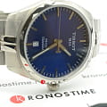 Белые часовые метки и стрелки чётко выделяются на синем циферблате, облегчая читаемость показателей. Наручные часы выполнены из титана, материал отличается долговечностью и не вызывает аллергии. Кварцевый калибр ETA 955.112. Водостойкость 100 метров. Прочное сапфировое стекло. Индикатор разряда элемента питания. Окошко даты. Габариты: 39 x 39 x 9 мм.