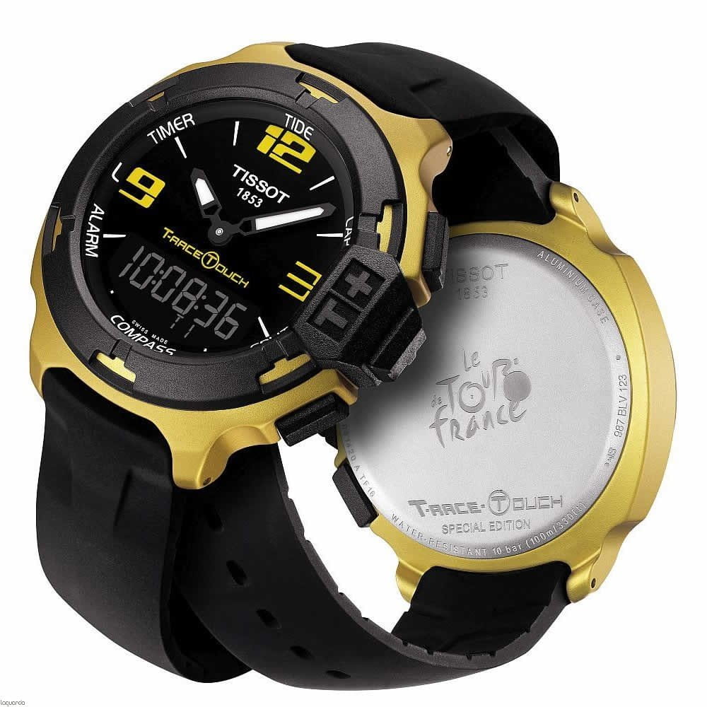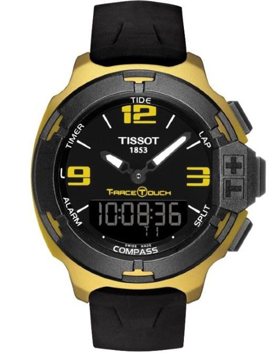 TISSOT T0814209705707 Touch Collection T-Race - мужские кварцевые наручные часы Корпус этих часов среднего размера (4215 мм) и выполнен из алюминия с PVD-покрытием цвета желтого золота Модель TISSOT T0814209705707 Touch Collection T-Race имеет устойчивое к царапинам сапфировое стекло, ремешок из натурального каучука черного цвета, черный циферблат Калибр механизма: ETA E49301 Класс водозащиты: 100 м / 10 АТМ (разрешается плавание и ныряние без акваланга) Дополнительные функции и особенности: отображение числа, полностью автоматический календарь, второе время (GMT), будильник, хронограф (секундомер), таймер (обратный отсчет), отображение данных о приливах и отливах, компас, сенсорный дисплей Полная заводская комплектация TISSOT: оригинальные часы, фирменная коробка, инструкция, сервисная книжка, роман о часовой фабрике, миникаталог, замшевый фирменный чехол черного цвета для хранения и/или переноски часов, кассовый и товарный чеки Международная гарантия 2 года Производство и сборка: Швейцария