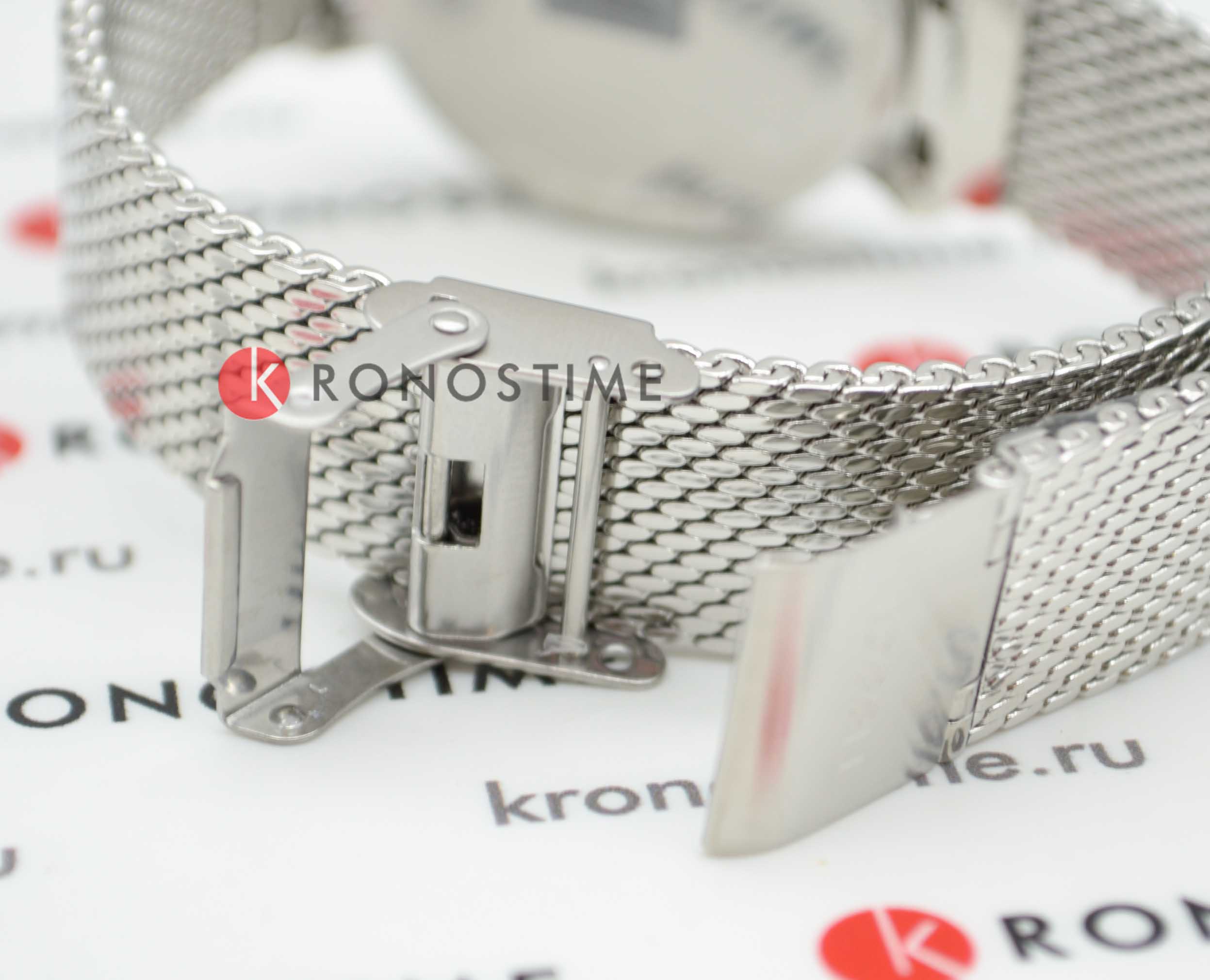 Стальной браслет миланского плетения на раскладном замкеРаскладной замокДанный вариант застежки используется только на часах с металлическим браслетом. Отличительная особенность такого крепления в том, что длина браслета становится универсальной и вы можете самостоятельно отрегулировать нужный вам размер – застежка просто двигается по браслету часов., обеспечивающей комфортное ношение и надёжную фиксацию на запястье. Водозащита до 50 метров (5 бар) позволяет использовать часы в повседневной жизни, защищая их от случайных брызг и дождя.