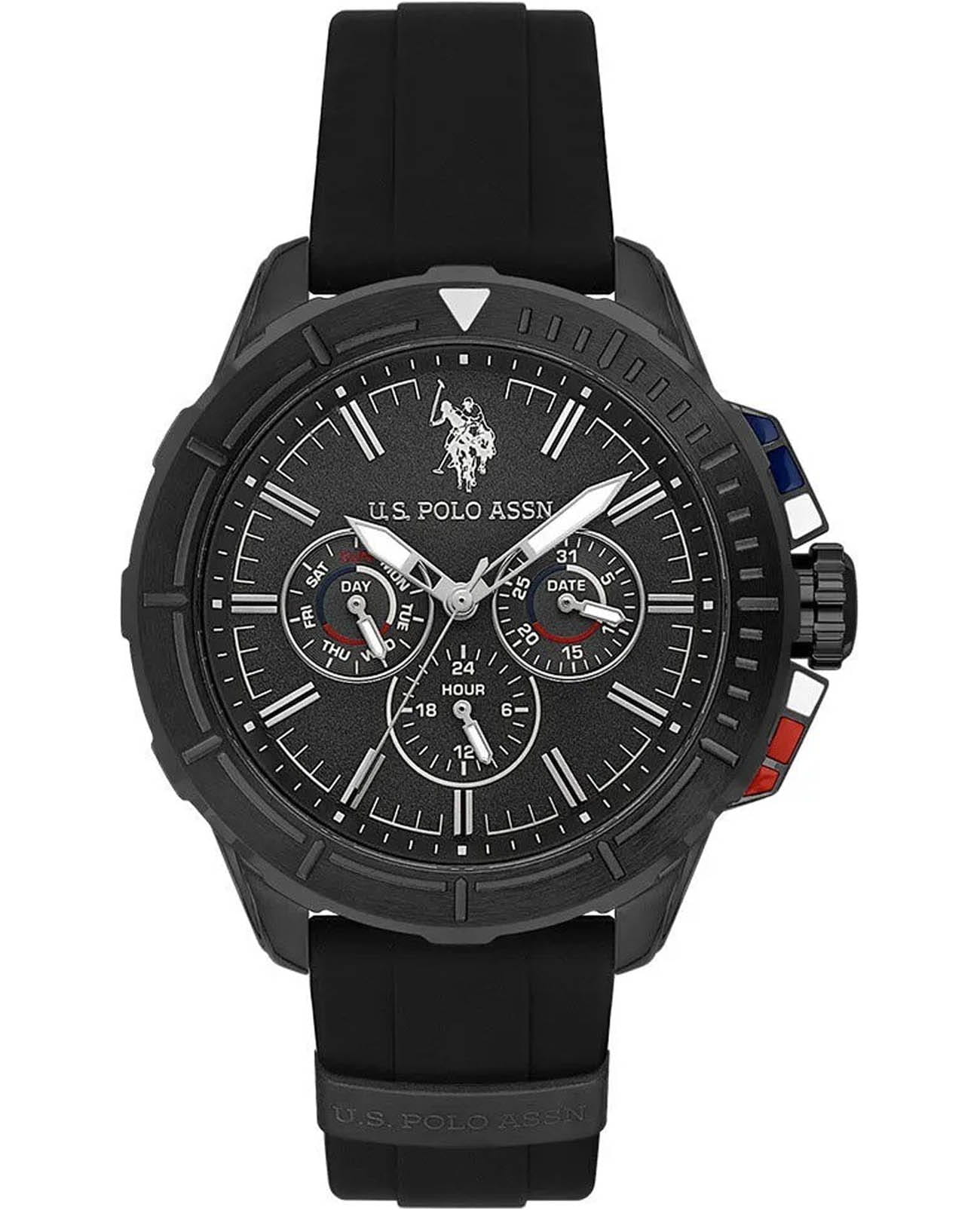 Мужские изысканные американские часы U.S. Polo Assn. Crossing USPA1066-05, кварцевый механизм с высокой точностью. Минеральное стеклоМинеральное стеклоМинеральное стекло представляет собой искусственно выращенный минерал кварца. Такое стекло отличается особой устойчивостью к повреждениям и царапинам. Уступает по некоторым качествам сапфировому стеклу. устойчивое к появлению царапин, обладающее высокой прозрачностью. Корпус изготовлен из нержавеющей стали с PVDPVDУльтратонкое покрытие наносится в технике вакуумного напыления, сочетает в себе нитрид титана особой прочности со слоем золота или оксида хрома. Несёт в себе декоративную или защитную функцию. покрытием с поворотным безелемБезельВнешний ободок, закрепляющий стекло. В спортивных часах так называется поворотное кольцо с делениями на циферблате, выполняет роль таймера – замеряет отрезки времени на шкале. Неподвижный безель – элемент декора. Однонаправленно вращающийся безель на дайверских часах позволяет фиксировать моменты погружения и выныривания на поверхность.. На стильном черном циферблате три дополнительных индикатора. Центральные часовая, минутная и секундная стрелки. Индикация даты и дня недели. 12/24х часовой формат времени. Класс водозащиты: 50 метров, позволит защитить корпус от случайных брызг или капель дождя. Силиконовый ремешок черного цвета со стандартной застежкой безупречно дополняет корпус. Стрелки оснащены люминесцентным покрытиемЛюминесцентное покрытиеПозволяет считывать показания времени в темноте. Производители наносят на стрелки, часовые индексы, безель или поверхность циферблата светонакопительный состав, дающий холодное свечение., обеспечивающим хорошую читаемость в темноте. Модель подчёркивает индивидуальность владельца и идеально подходит как для повседневного, так и для делового образа.