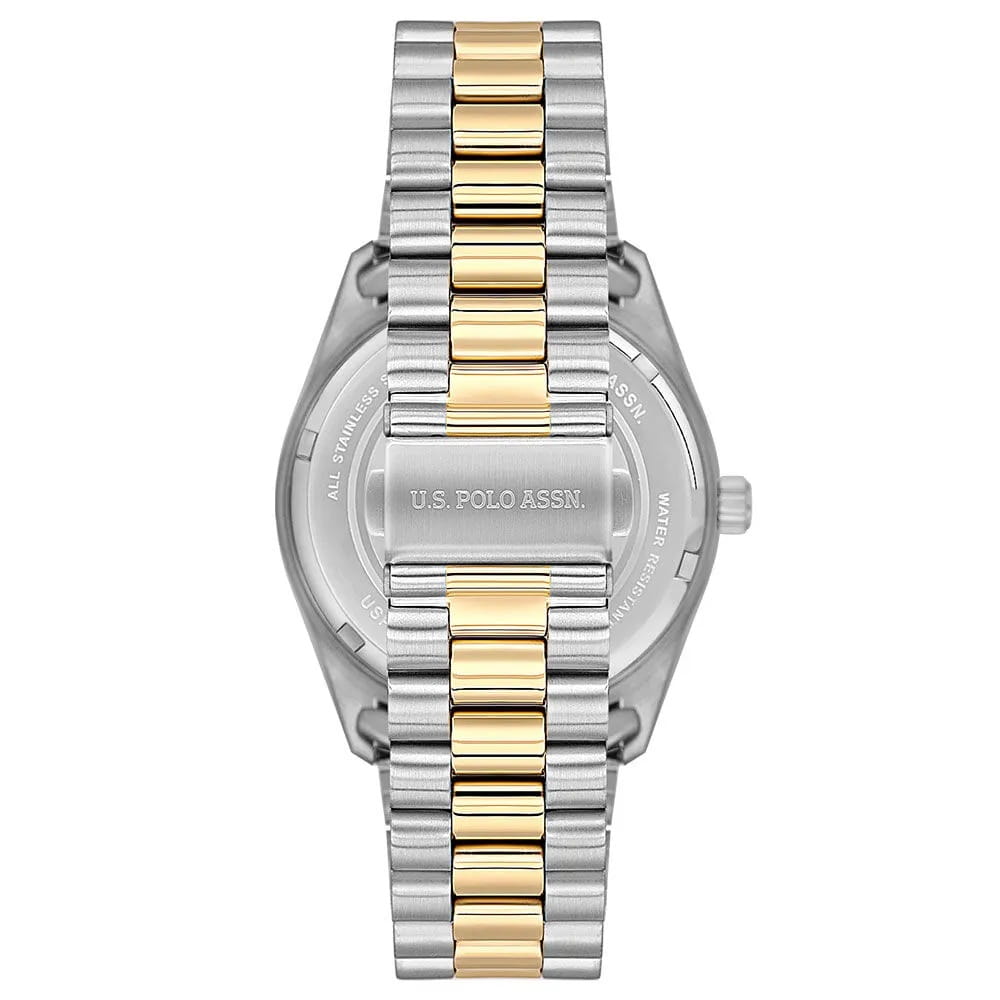 Мужские американские часы U.S. Polo Assn. Fundamental USPA1100B-06 обладают кварцевым механизмом с высокой точностью. Минеральное стеклоМинеральное стеклоМинеральное стекло представляет собой искусственно выращенный минерал кварца. Такое стекло отличается особой устойчивостью к повреждениям и царапинам. Уступает по некоторым качествам сапфировому стеклу. устойчивое к появлению царапин, обладающее высокой прозрачностью. Изысканный корпус изготовлен из нержавеющей стали, диаметром 42 мм. Лаконичные центральные часовая, минутная и секундная стрелки. Стрелки с люминесцентным покрытиемЛюминесцентное покрытиеПозволяет считывать показания времени в темноте. Производители наносят на стрелки, часовые индексы, безель или поверхность циферблата светонакопительный состав, дающий холодное свечение., обеспечивающим хорошую читаемость в темноте. Класс водозащиты: 50 метров позволит защитить корпус от случайных брызг или капель дождя. Окошко даты находится в положении 3 часа, окошко дня недели в положении 12 часов. Стальной браслет с частичным PVD-покрытиемPVDУльтратонкое покрытие наносится в технике вакуумного напыления, сочетает в себе нитрид титана особой прочности со слоем золота или оксида хрома. Несёт в себе декоративную или защитную функцию. на раскладной застёжкеРаскладная застёжкаТакой тип застёжки используется только на браслетах из металла. Она никогда не раскрывается полностью, происходит разделение на 2 и более частей. Раскладывающая застёжка снизит вероятность потери часов к минимуму. обеспечивает комфорт и удобство в использовании, добавляя завершающий штрих к этому стильному и высокоэффективному аксессуару. Это практичный и стильный инструмент для активной повседневности, объединяющий точный механизм и удобство.