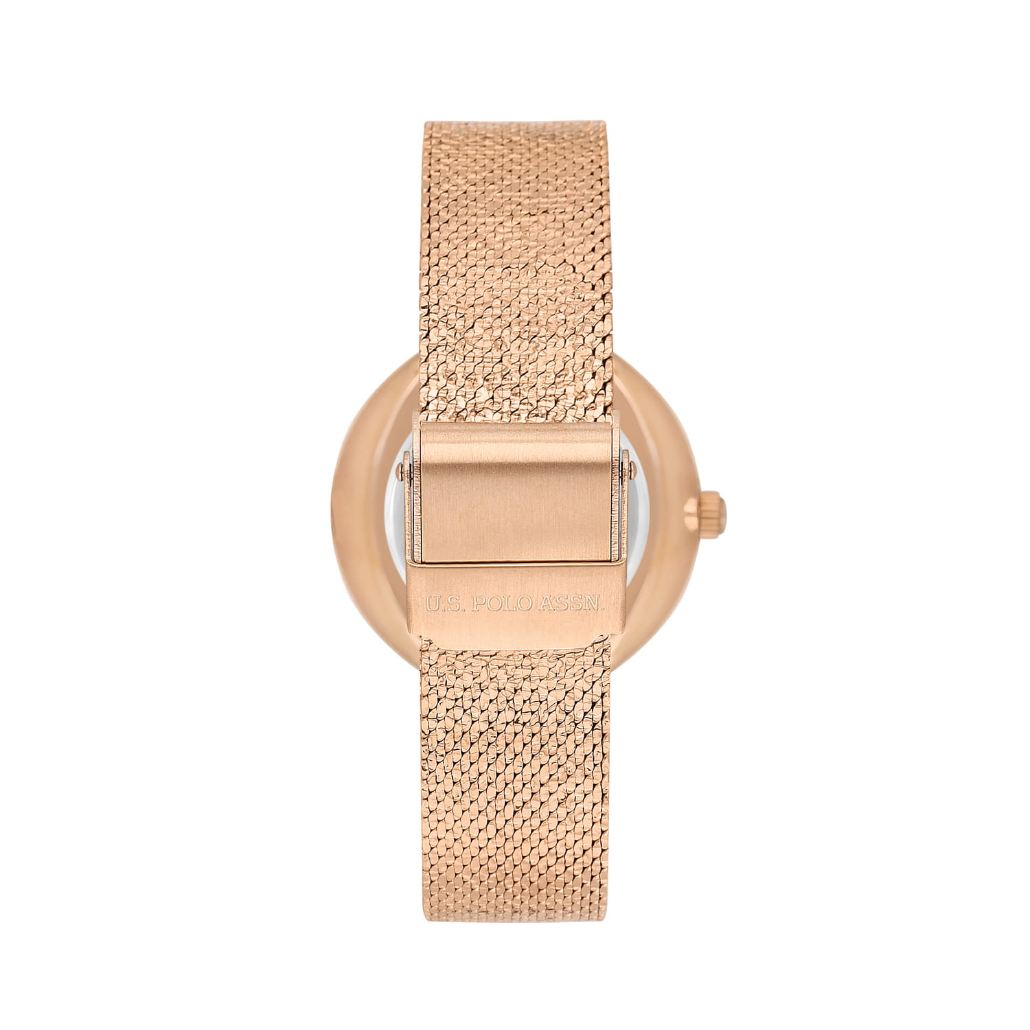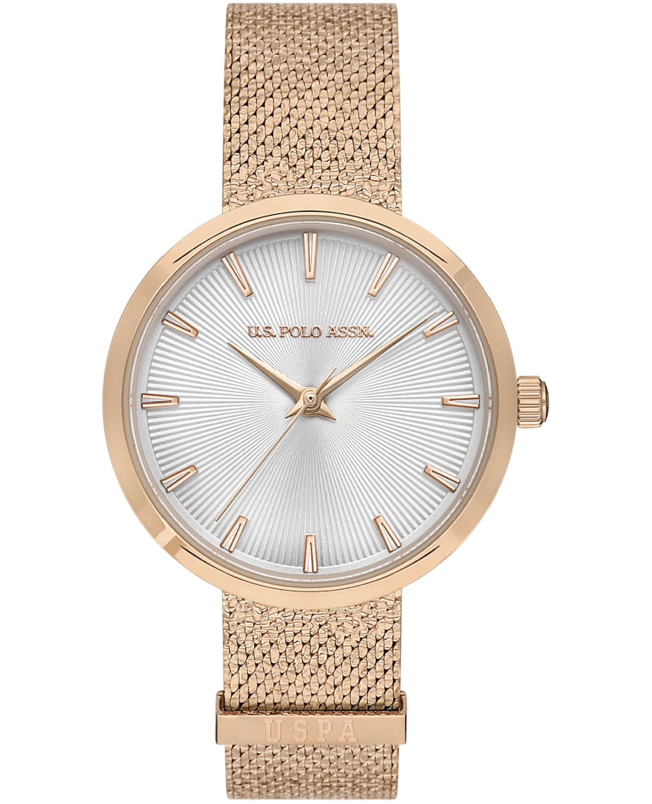 Женские часы U.S. Polo Assn. USPA2078-02 кварцевый механизм с высокой точностью. Минеральное стеклоМинеральное стеклоМинеральное стекло представляет собой искусственно выращенный минерал кварца. Такое стекло отличается особой устойчивостью к повреждениям и царапинам. Уступает по некоторым качествам сапфировому стеклу. устойчивое к появлению царапин, обладающее высокой прозрачностью. Корпус изготовлен из нержавеющей стали. Класс водозащиты: 30 метров, позволит защитить корпус от случайных брызг или капель дождя. Стальной браслет миланского плетения на раскладной застёжкеРаскладная застёжкаТакой тип застёжки используется только на браслетах из металла. Она никогда не раскрывается полностью, происходит разделение на 2 и более частей. Раскладывающая застёжка снизит вероятность потери часов к минимуму. с IP-покрытиемIP-покрытиеМетод ионного напыления. Демонстрирует повышенную устойчивость к истиранию, окислению и химическим веществам. Под воздействием высокого давления и температуры около 1500°C молекулы металла надёжно соединяются с частицами корпуса часов.. Неподвижный безельБезельВнешний ободок, закрепляющий стекло. В спортивных часах так называется поворотное кольцо с делениями на циферблате, выполняет роль таймера – замеряет отрезки времени на шкале. Неподвижный безель – элемент декора. Однонаправленно вращающийся безель на дайверских часах позволяет фиксировать моменты погружения и выныривания на поверхность. с IP-покрытиемIP-покрытиеМетод ионного напыления. Демонстрирует повышенную устойчивость к истиранию, окислению и химическим веществам. Под воздействием высокого давления и температуры около 1500°C молекулы металла надёжно соединяются с частицами корпуса часов..