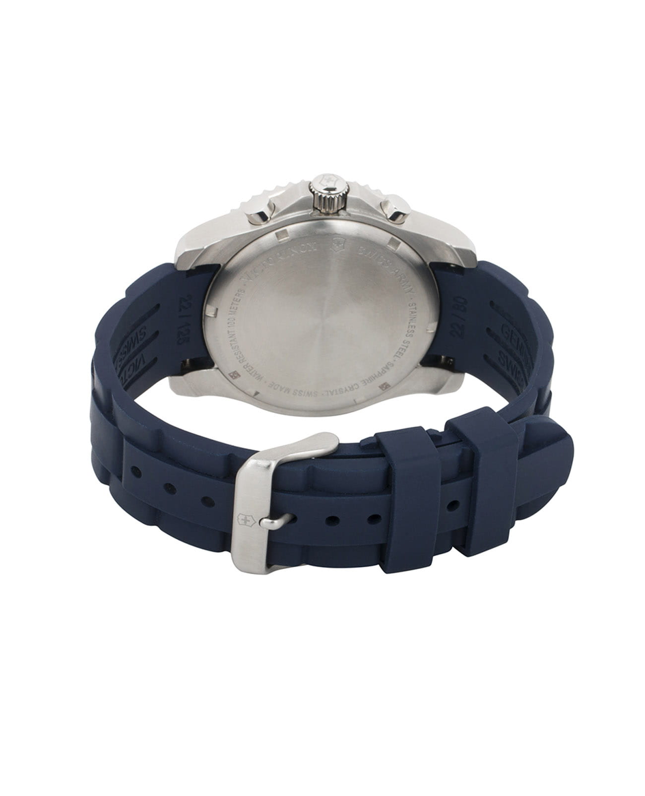 Мужские швейцарские часы- хронографХронографФункция позволяет измерять отрезки времени с особой точностью: часы, минуты, секунды. Верным признаком хронографа является наличие на циферблате 3 дополнительных окошек-счётчиков. Victorinox Maverick 241690, кварцевый механизм с высокой точностью. Сапфировое стеклоСапфировое стеклоПрочный и надёжный материал из кристалла сапфира синтетического происхождения, характеризующийся особой твёрдостью и устойчивостью к царапинам и повреждениям. с трёхслойным антибликовым покрытием. Часы с секундомеромСекундомерСекундоме́р — прибор, способный измерять интервалы времени с точностью до долей секунды. и тахиметромТахиметрРазмеченная шкала, располагается на ободке или безеле часов. Тахиметр позволяет рассчитать скорость на определённом участке пути, расстояние измеряется в километрах или милях.. Корпус часов выполнен из нержавеющей стали. Вращающийся стальной безельБезельВнешний ободок, закрепляющий стекло. В спортивных часах так называется поворотное кольцо с делениями на циферблате, выполняет роль таймера – замеряет отрезки времени на шкале. Неподвижный безель – элемент декора. Однонаправленно вращающийся безель на дайверских часах позволяет фиксировать моменты погружения и выныривания на поверхность. с PVD-покрытиемPVDУльтратонкое покрытие наносится в технике вакуумного напыления, сочетает в себе нитрид титана особой прочности со слоем золота или оксида хрома. Несёт в себе декоративную или защитную функцию.. Стрелки и метки с люминесцентным покрытиемЛюминесцентное покрытиеПозволяет считывать показания времени в темноте. Производители наносят на стрелки, часовые индексы, безель или поверхность циферблата светонакопительный состав, дающий холодное свечение.. Класс водозащиты: 100 метров, позволит плавать, нырять и заниматься другими водными видами спорта. Каучковый ремешок на стандартной застежке.