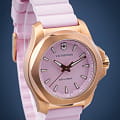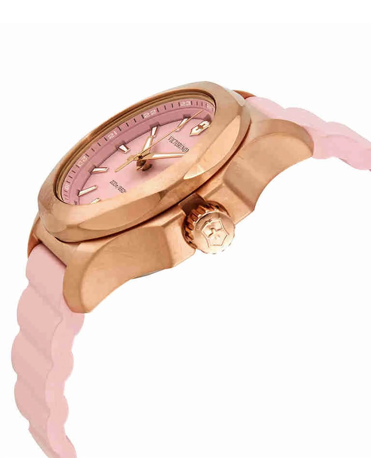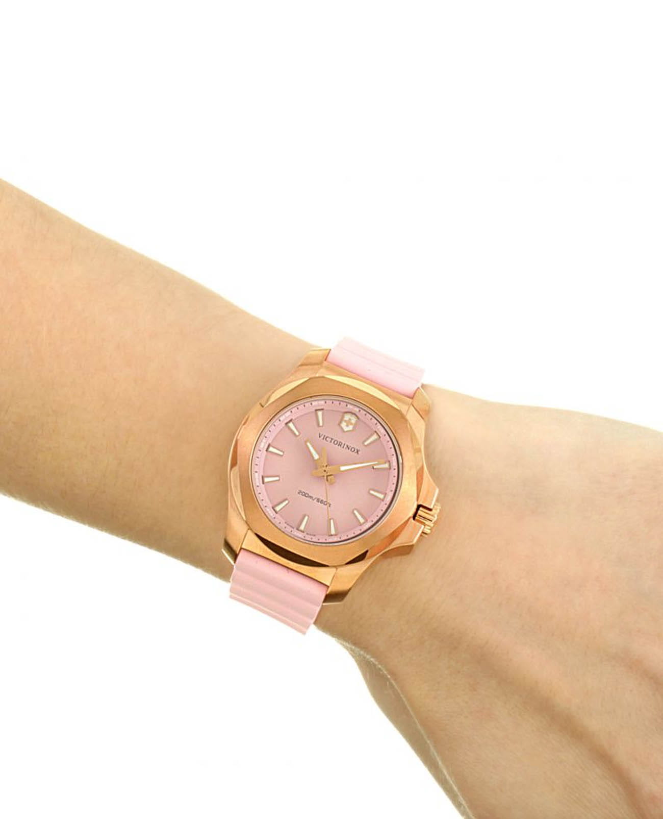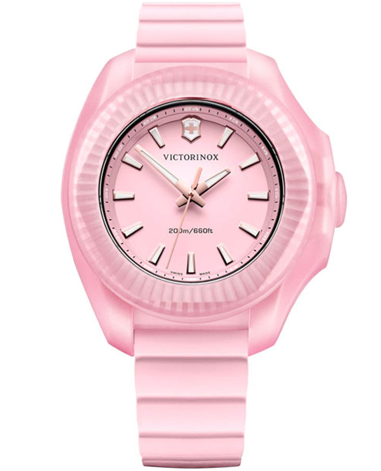 Женские швейцарские часы Victorinox I.N.O.X. V 241807. Сапфировое стеклоСапфировое стеклоПрочный и надёжный материал из кристалла сапфира синтетического происхождения, характеризующийся особой твёрдостью и устойчивостью к царапинам и повреждениям. с трёхслойным антибликовым покрытием. Корпус часов выполнен из нержавеющей стали 316L с PVD-покрытиемPVDУльтратонкое покрытие наносится в технике вакуумного напыления, сочетает в себе нитрид титана особой прочности со слоем золота или оксида хрома. Несёт в себе декоративную или защитную функцию.. Практичный каучуковый ремешок на стандартной застёжке. Влагозащита: 200 метров, позволит плавать, нырять и заниматься другими водными видами спорта. Стрелки и метки с люминесцентным покрытиемЛюминесцентное покрытиеПозволяет считывать показания времени в темноте. Производители наносят на стрелки, часовые индексы, безель или поверхность циферблата светонакопительный состав, дающий холодное свечение.. В комплекте съемный защитный бампер.
