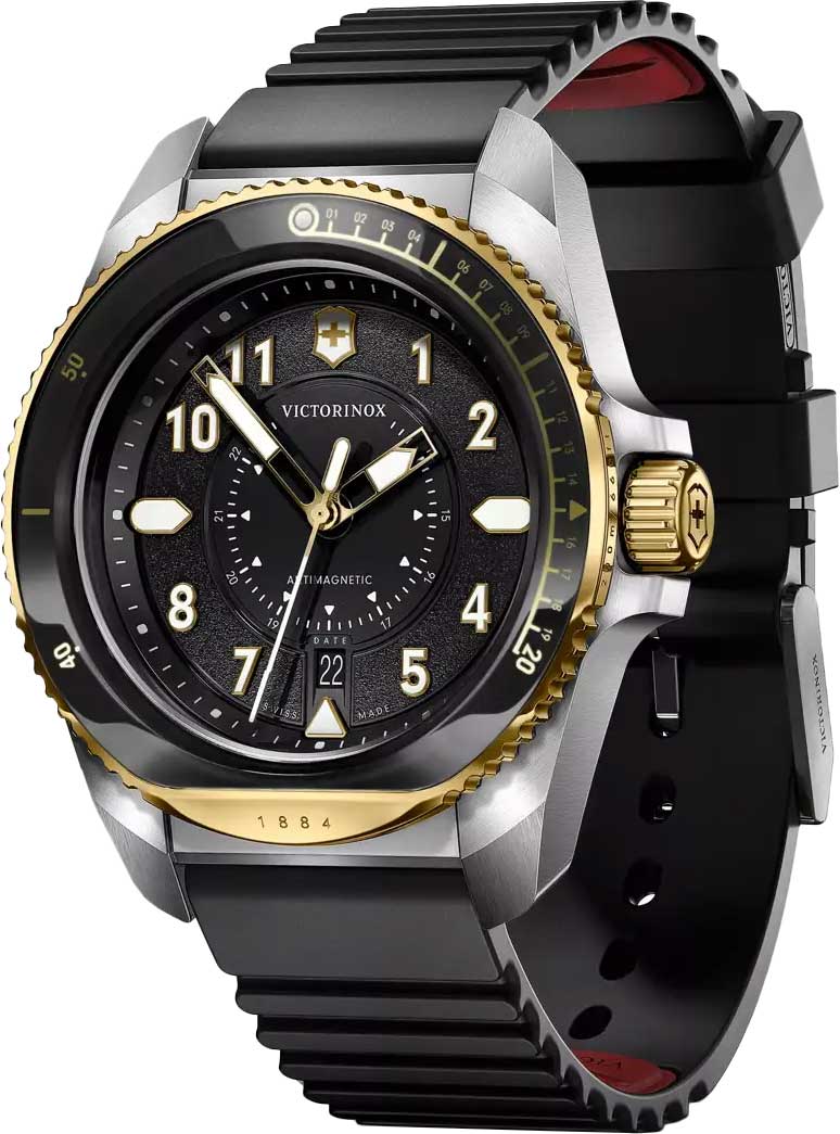Мужские швейцарские часы Victorinox 242014. Сапфировое стеклоСапфировое стеклоПрочный и надёжный материал из кристалла сапфира синтетического происхождения, характеризующийся особой твёрдостью и устойчивостью к царапинам и повреждениям. с трёхслойным антибликовым покрытием. Корпус часов выполнен из стали. Влагозащита: 200 метров, позволит плавать, нырять и заниматься другими водными видами спорта. Стрелки и метки с люминесцентным покрытиемЛюминесцентное покрытиеПозволяет считывать показания времени в темноте. Производители наносят на стрелки, часовые индексы, безель или поверхность циферблата светонакопительный состав, дающий холодное свечение.. Окошко даты находится в положении 6 часов. БезельБезельВнешний ободок, закрепляющий стекло. В спортивных часах так называется поворотное кольцо с делениями на циферблате, выполняет роль таймера – замеряет отрезки времени на шкале. Неподвижный безель – элемент декора. Однонаправленно вращающийся безель на дайверских часах позволяет фиксировать моменты погружения и выныривания на поверхность. с PVD-покрытиемPVDУльтратонкое покрытие наносится в технике вакуумного напыления, сочетает в себе нитрид титана особой прочности со слоем золота или оксида хрома. Несёт в себе декоративную или защитную функцию.. Ремешок с классической застежкой и системой быстрой замены.